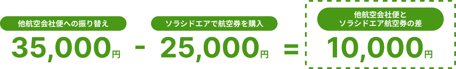 例)ソラシドエアで航空券を「25,000円」で購入、他航空会社または地上定期公共交通機関への振り替えに「35,000円」かかった場合