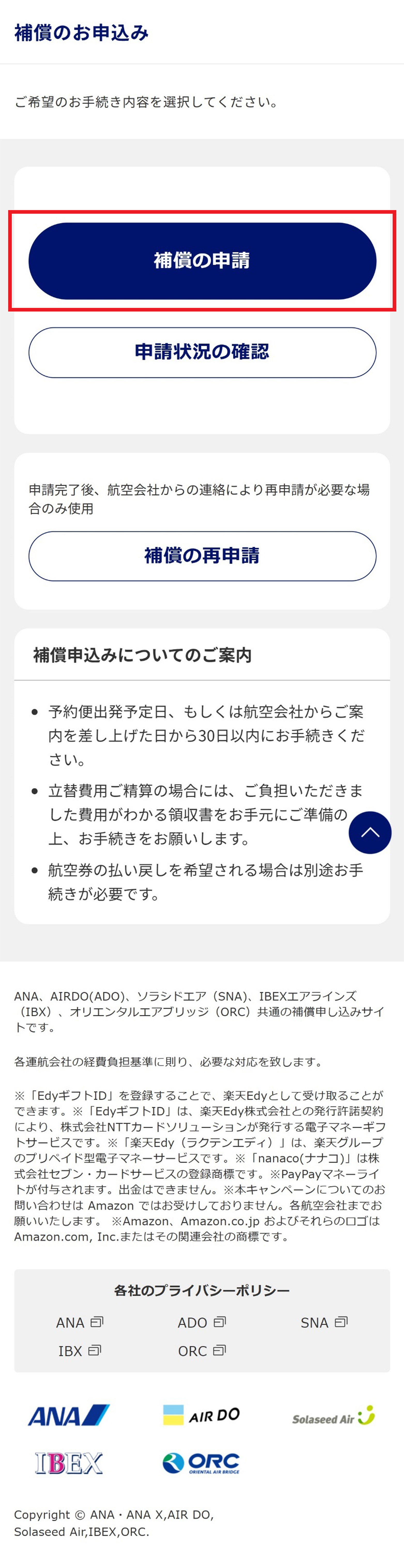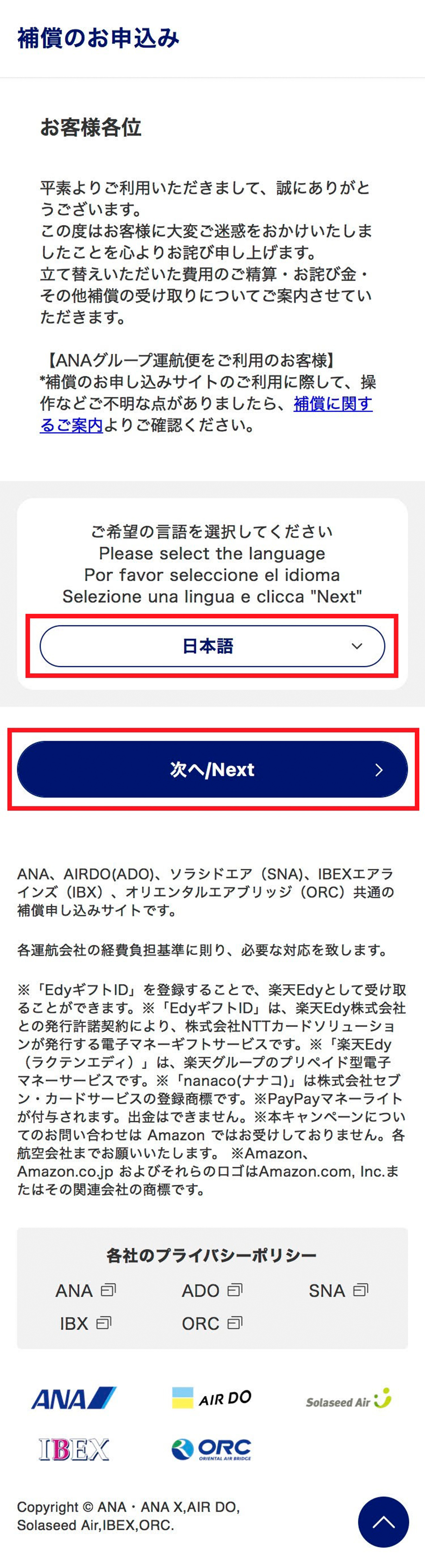 ※補償を受け取る搭乗便が複数ある場合、手続きを進める搭乗便が選択できます。対象の搭乗便を選択して、「次へ」を押下してください。