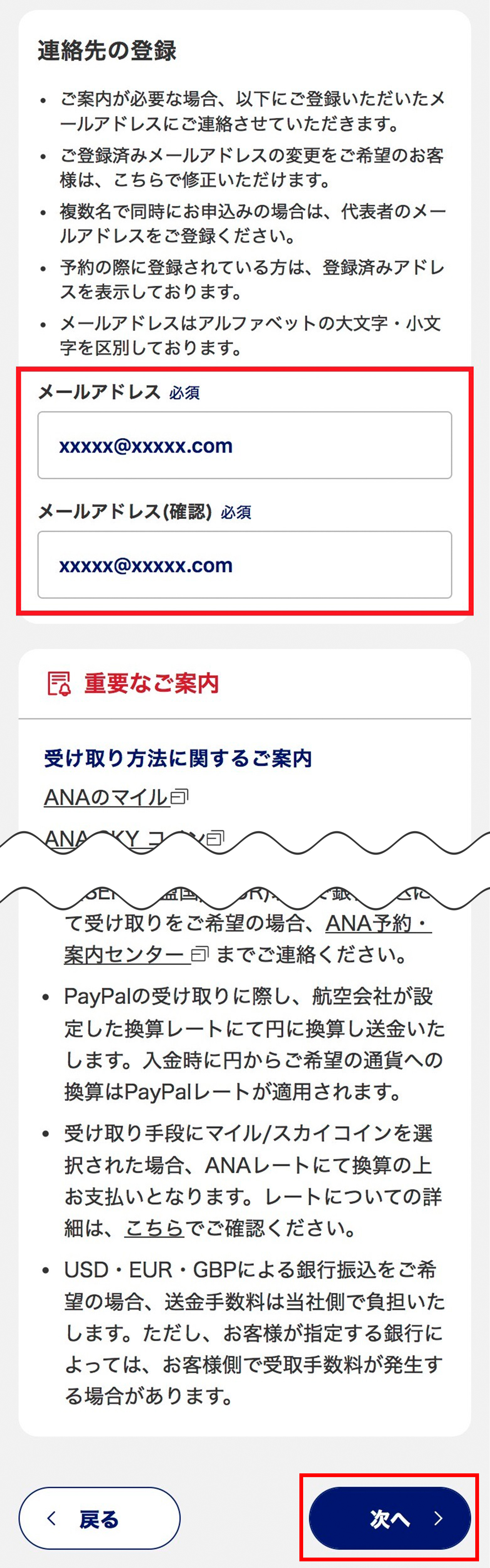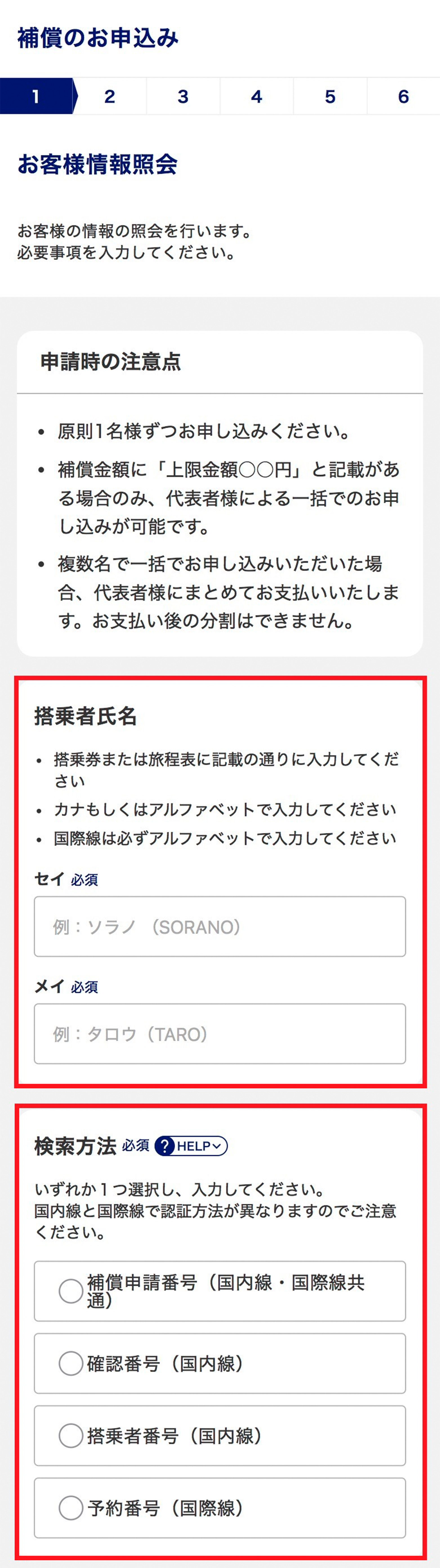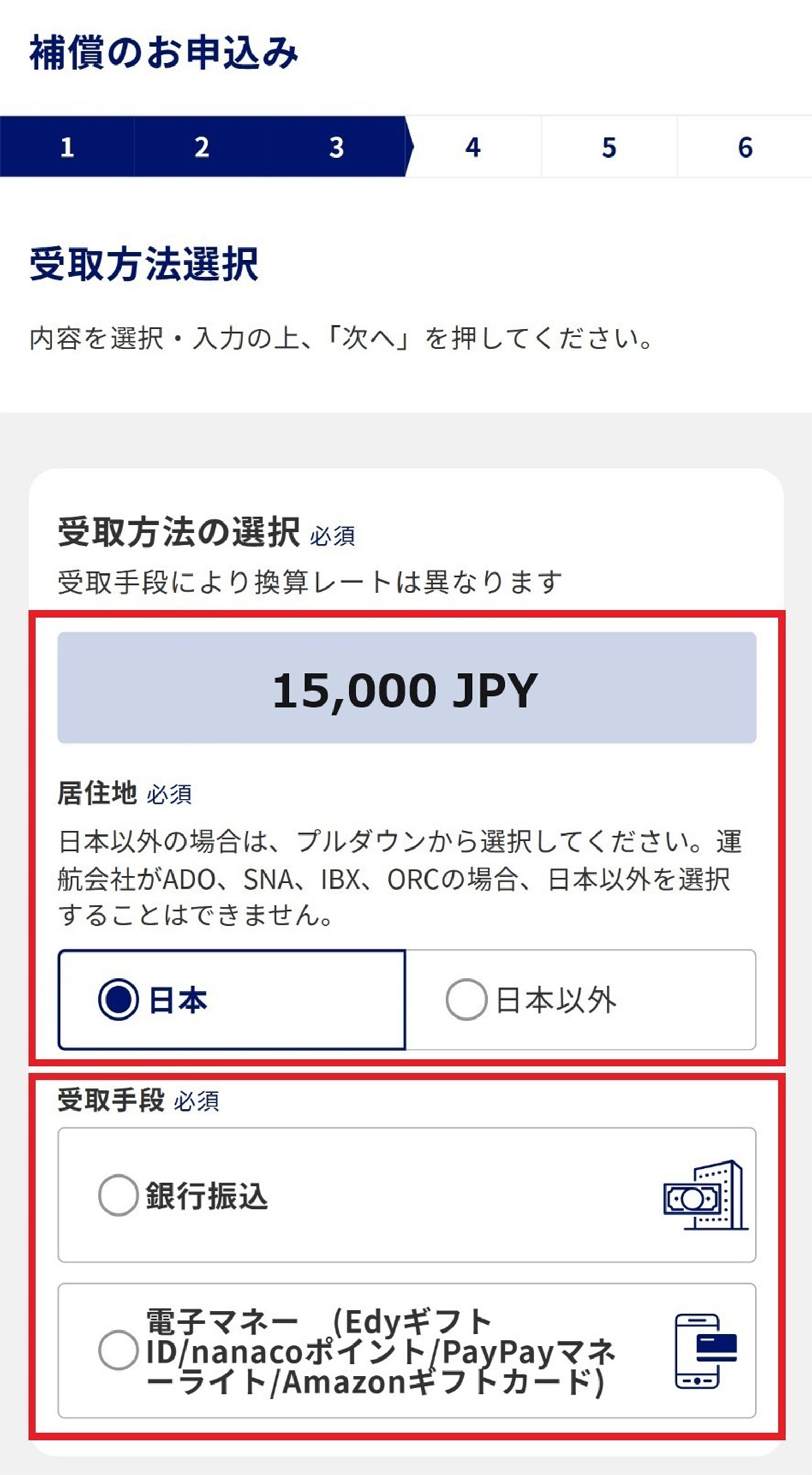 ※ソラシドエア運航便では「日本以外」は対応しておりません。受取手段の欄に表示されている内容が、お客様がご利用いただける補償の受取手段です。ご希望の受取手段を選択し、表示される案内に従って情報を入力してください。
