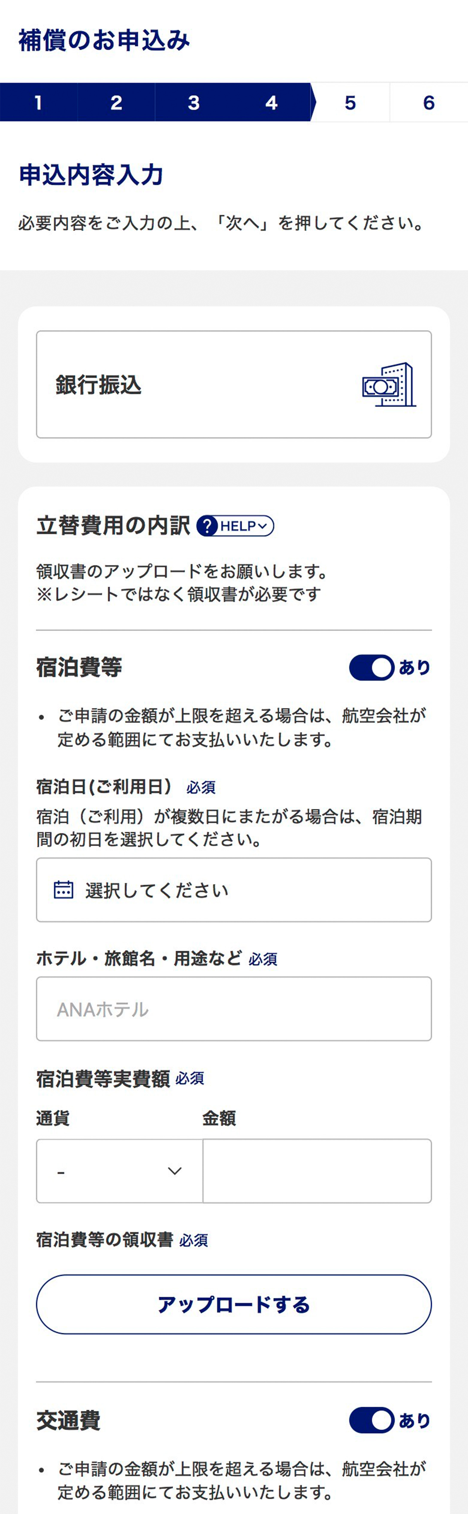 STEP08は交通費・宿泊費補償対象のお客様にのみに表示される画面です。補償を申し込む交通費・宿泊費の内容を入力し、「次へ」を押下してください。