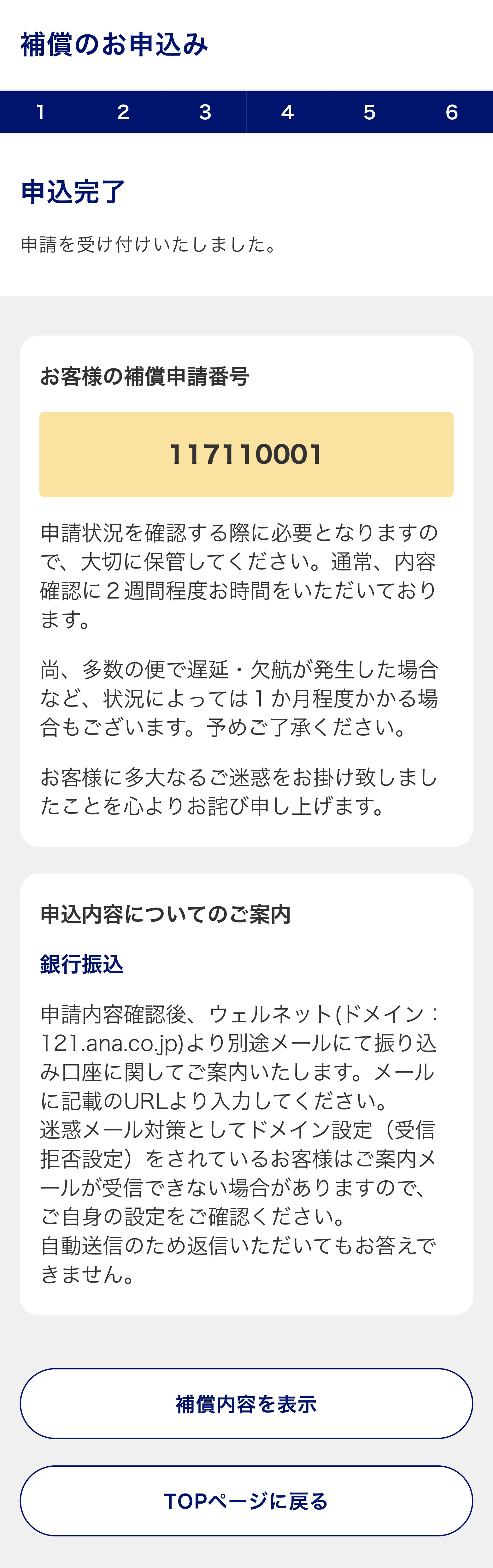 「申込完了」と画面に表示されたら、補償のお申し込みは完了です。補償申請番号は、印刷や、スクリーンショットで端末に保存する等、大切に保管してください。補償のお受け取りに関するメールが届きます。メールに記載のURLへアクセスし、補償をお受け取りください。