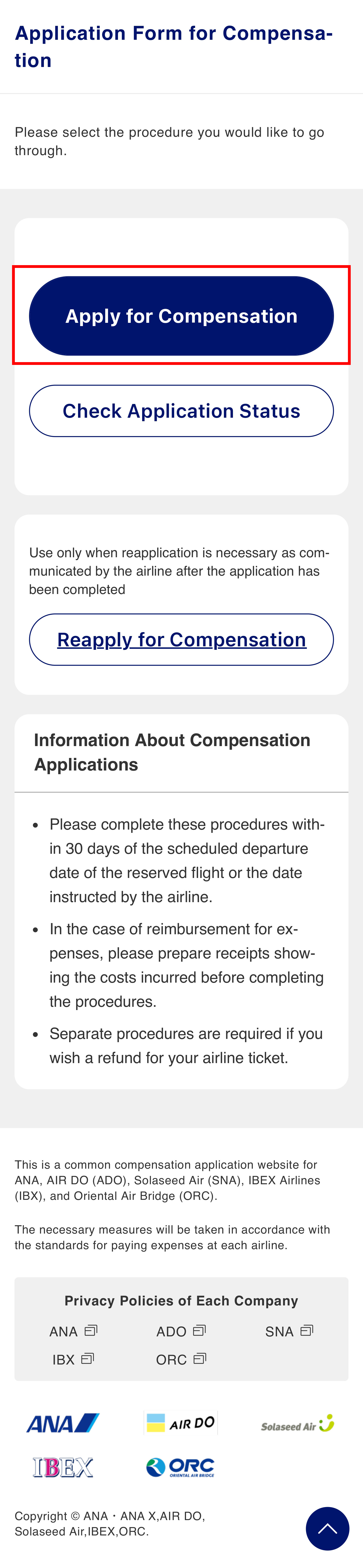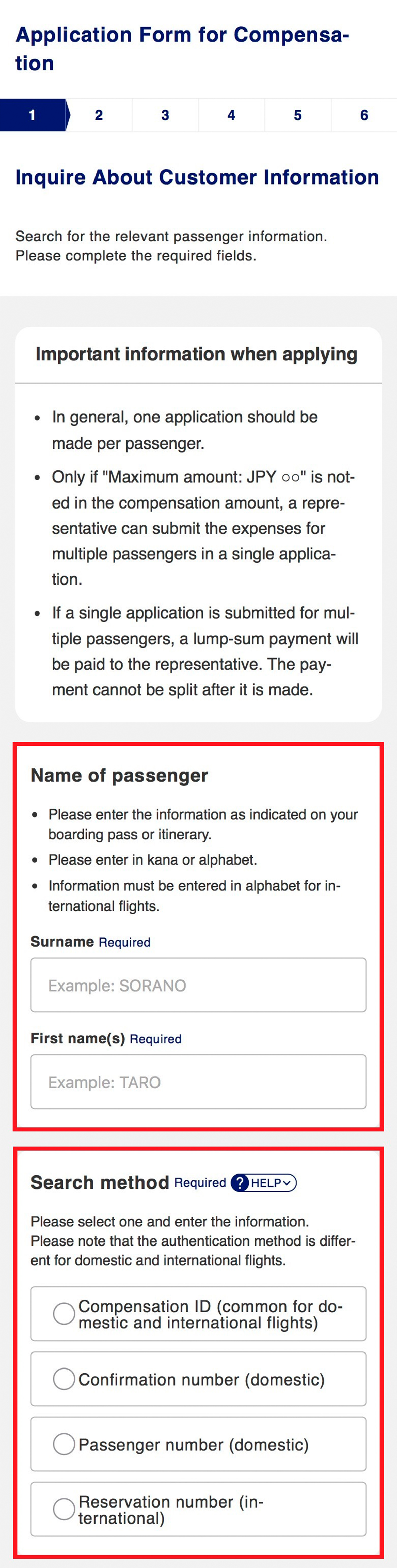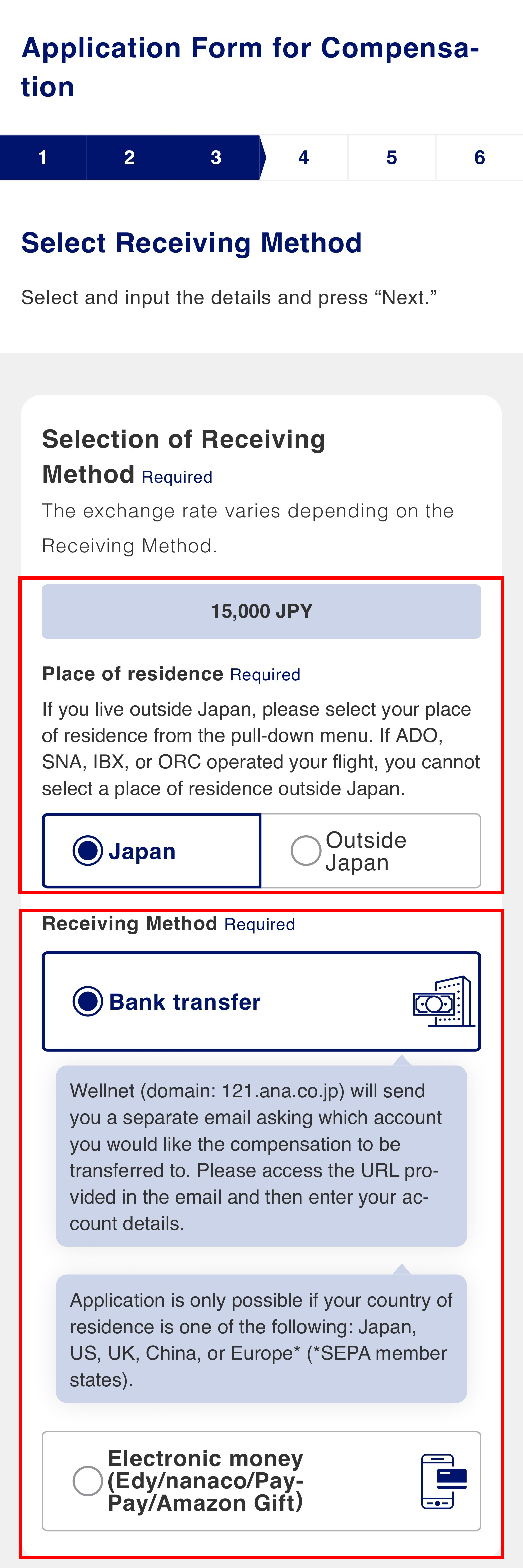*For flights operated by Solaseed Air, places of residence outside Japan are not covered. The information displayed in the Receiving Methods field shows the methods of receiving compensation that you can use. Select your preferred receiving method and then enter the information according to the displayed instructions.
