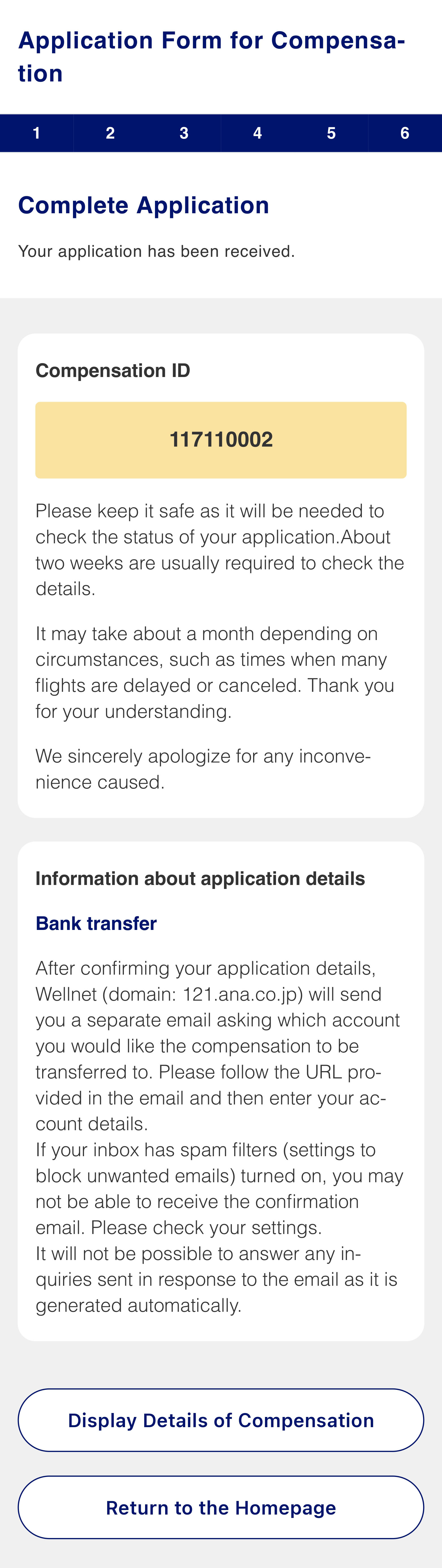When the "Application Completed" screen is displayed, your application for compensation is complete. Please keep your compensation application number safe by printing it out or saving it as a screenshot on your device. You will receive an email regarding the receipt of compensation. Please access the URL stated in the email and receive compensation.