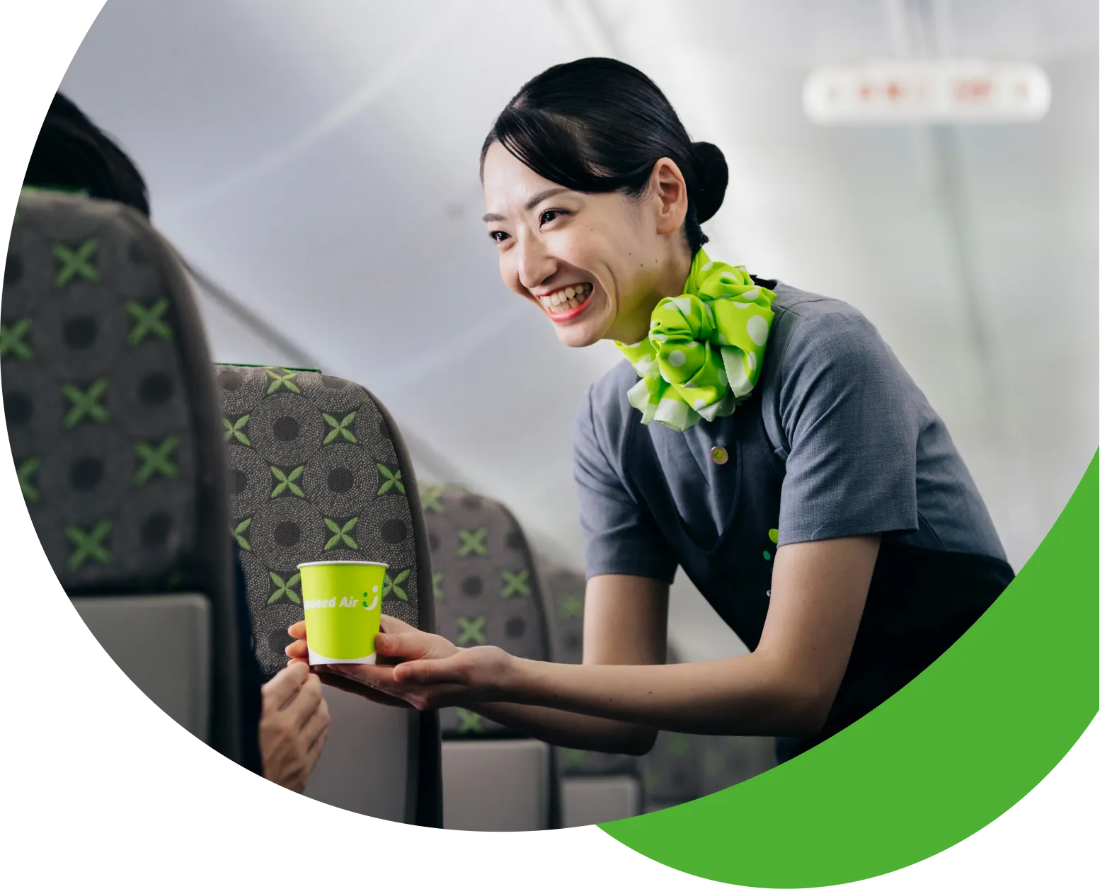 We adopted this color to represent a view of the world where people live in harmony with smiles and coexist, as well as Solaseed Air's youthfulness and growth, and evoke the image of the lush greenery of Kyushu.