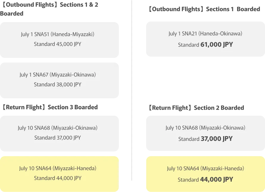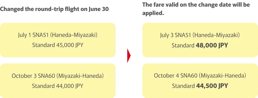 You purchased a round-trip Standard fare on June 1 for the outbound flight on July 1 (SNA51, Haneda to Miyazaki) and the return flight on October 3 (SNA60, Miyazaki to Haneda). If you change both flights on June 30, the fare valid on the date of change, June 30, will apply.