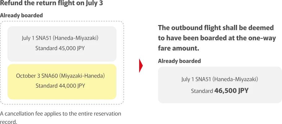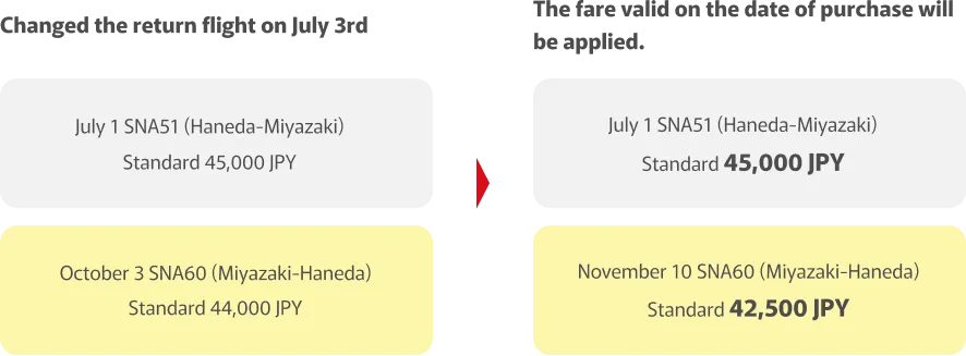 You purchased a round-trip Standard fare on June 1 for the outbound flight on July 1 (SNA51, Haneda to Miyazaki) and the return flight on October 3 (SNA60, Miyazaki to Haneda). If you change the return flight on July 3, the fare valid on the date of purchase, June 1, will apply.