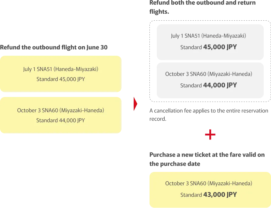 For example, even if you wish to refund only the outbound flight on June 30, you must first refund both the outbound and return flights together, and then purchase the return flight again as a new reservation.