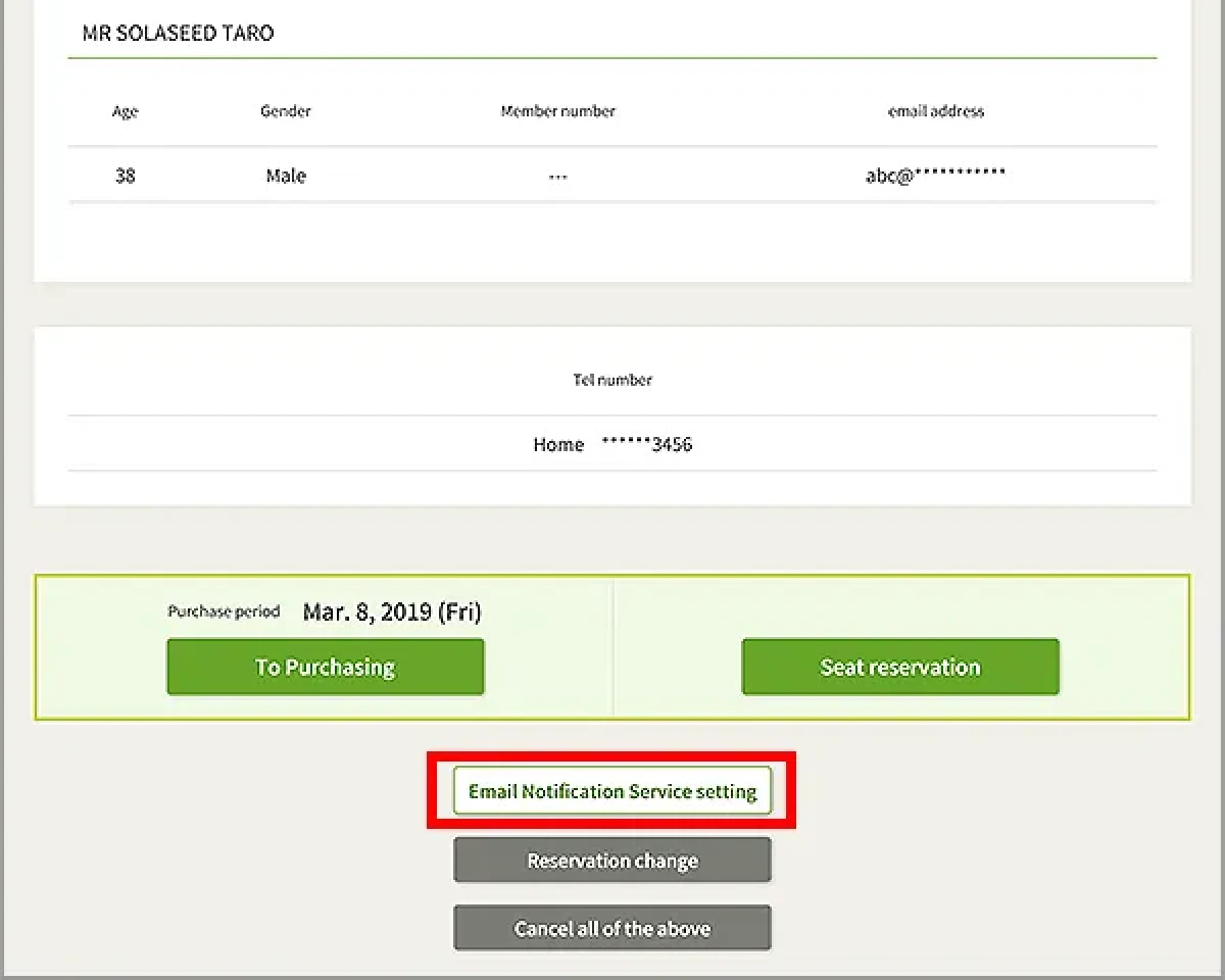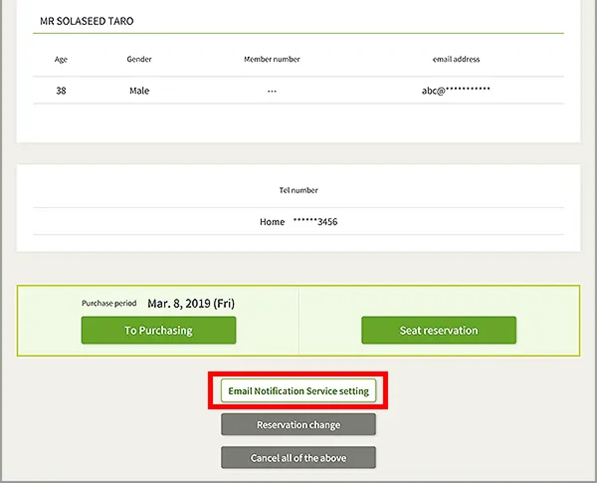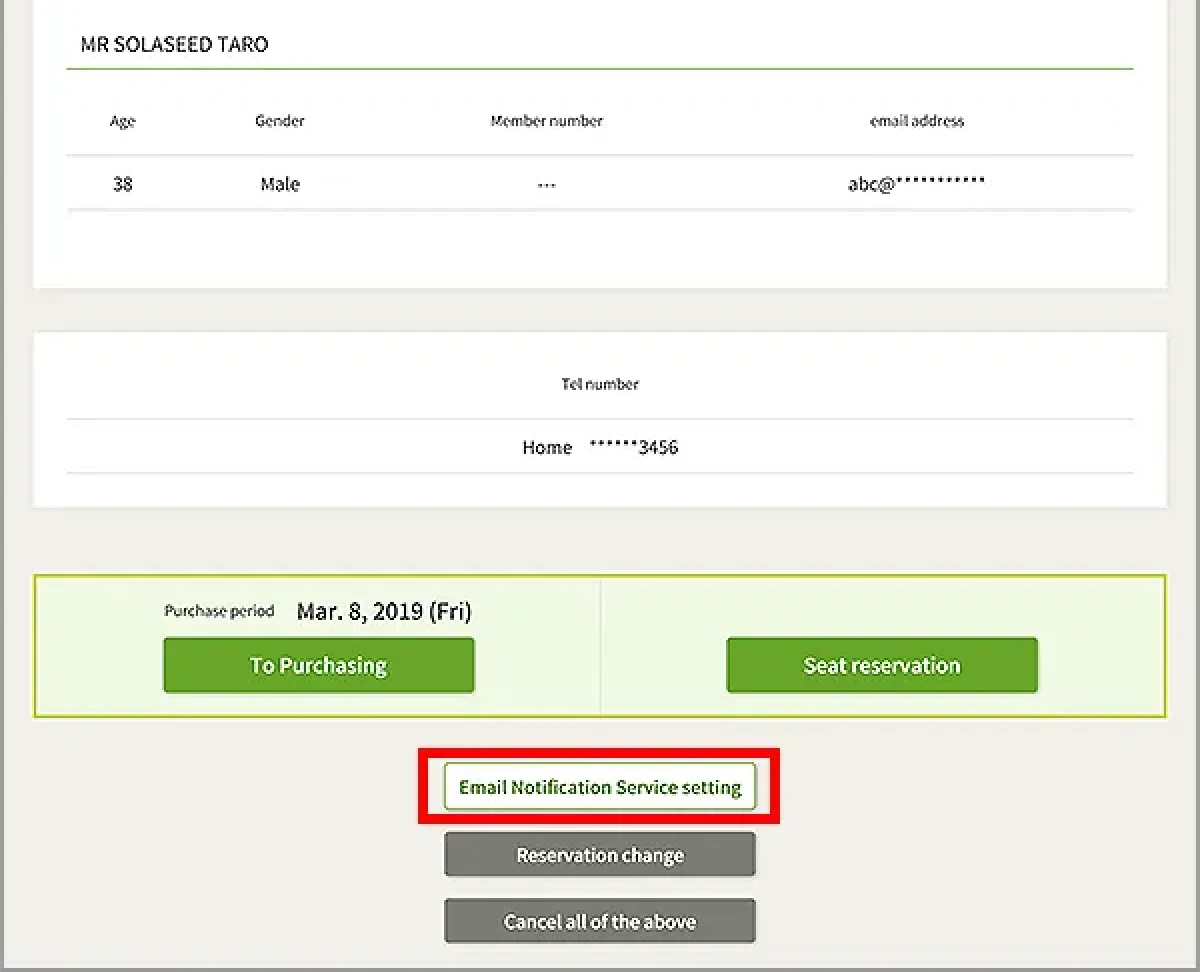 Select "Email Notification Service setting" from the "Reserved flight information" screen shown during the reservation complete / reservation confirmation.