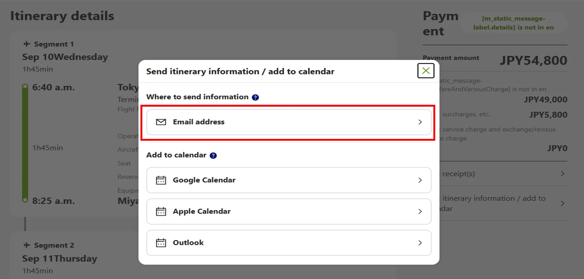 Please select "Email address" at the "Send itinerary information/add to calendar" screen.