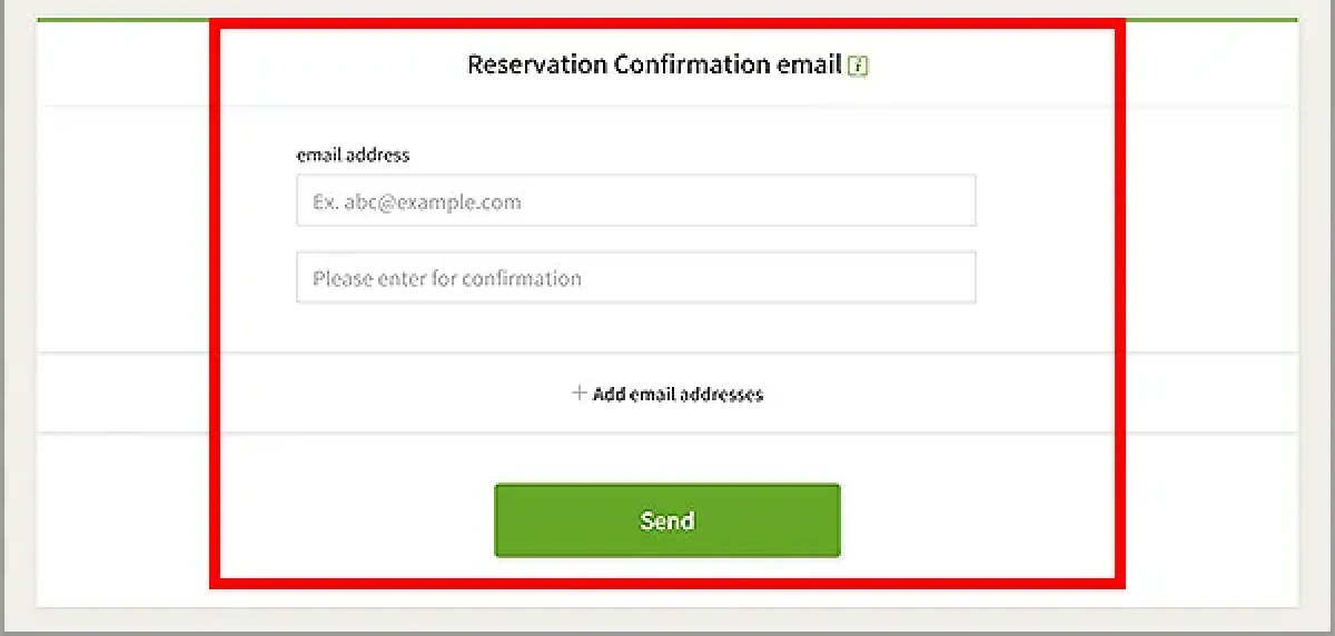 Fill in the 'email address' box inside the 'Reservation Confirmation Email' section of the screen for saving an email address for reservation-related notifications.