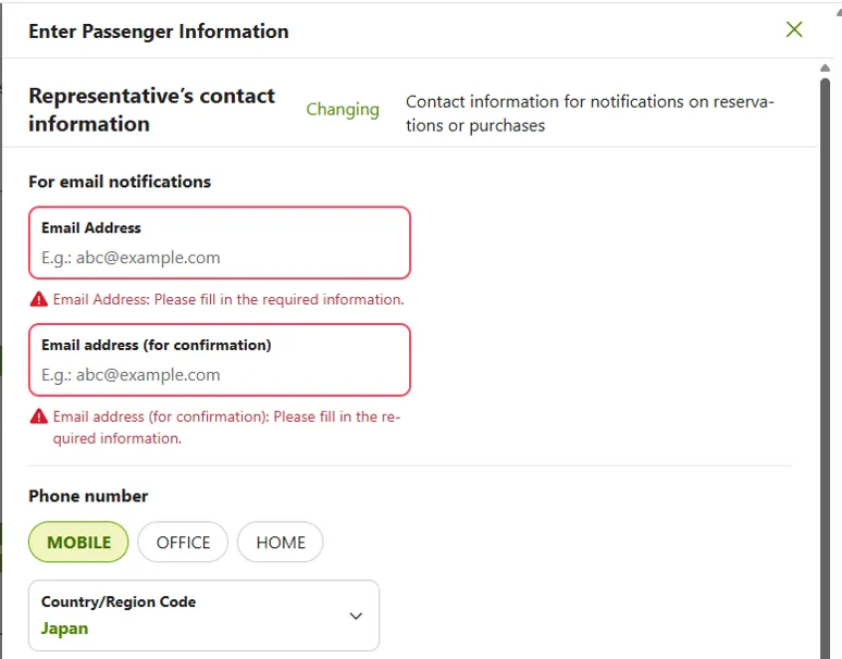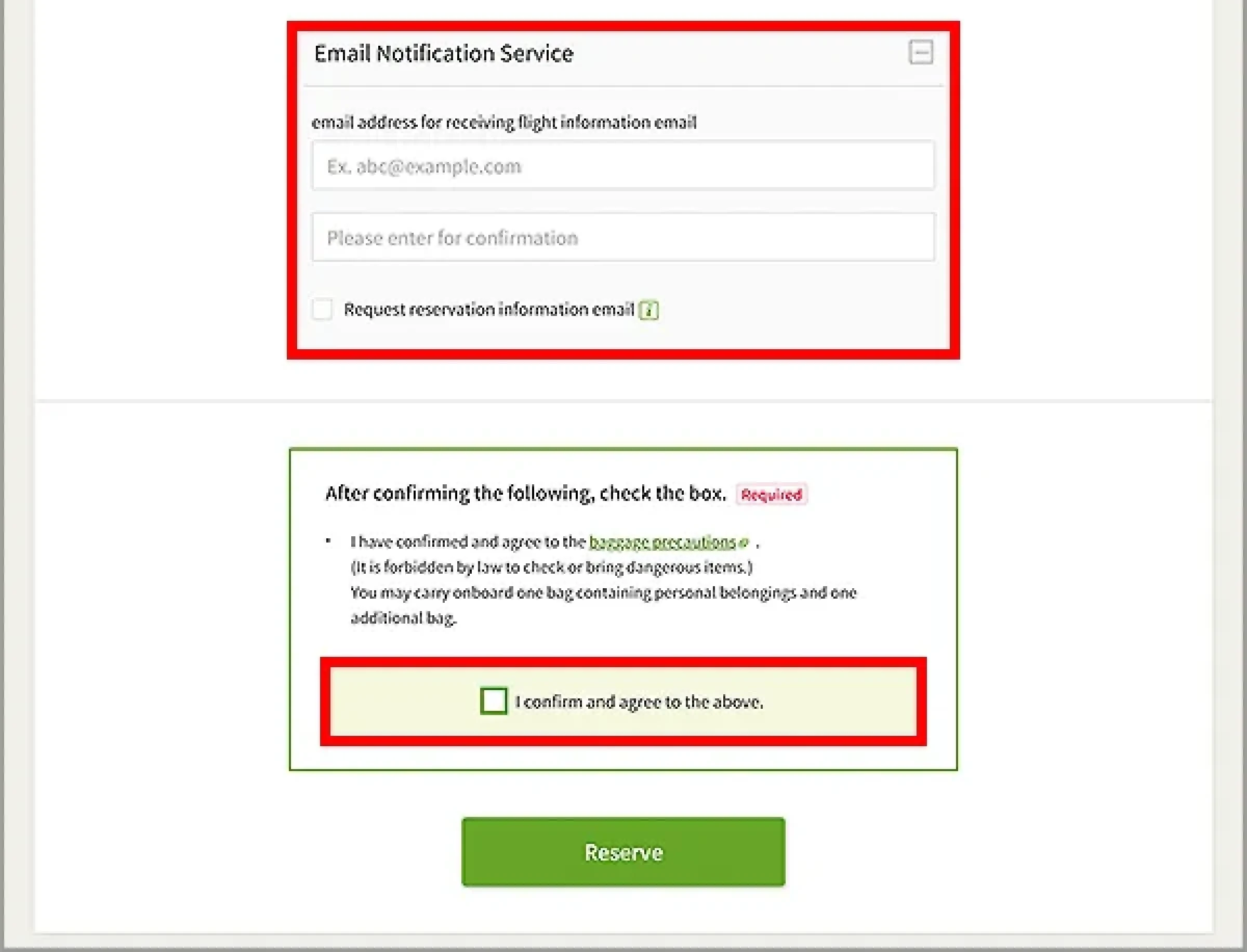 When making a reservation, please enter the email recipient's name and email address of the departure/Arrival notification email for each passenger in the "Other Information" section at the bottom of the "Enter Passenger Information" screen. We will send an email with flight information to the email address you registered.