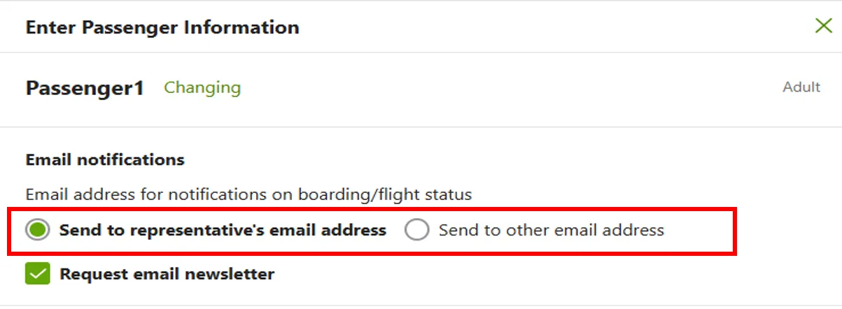 For each passenger, you can choose to receive notifications on boarding/flight status at the representative's email address or at the another specified email address.