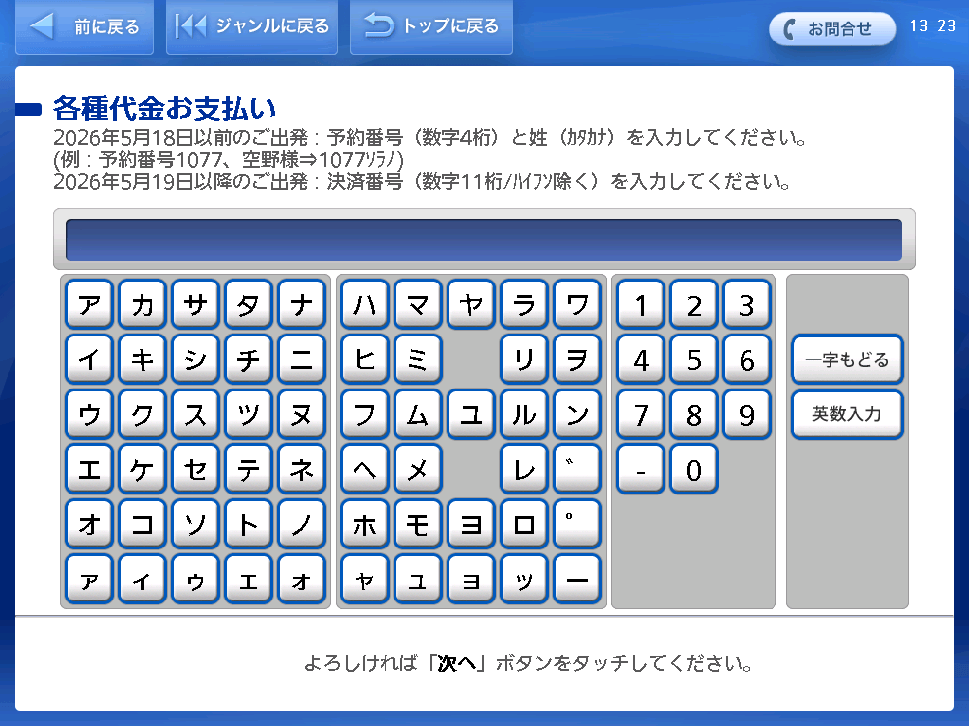 Input the following details and then tap "次へ (Next)". Reservation number (four digits) and name (last name)