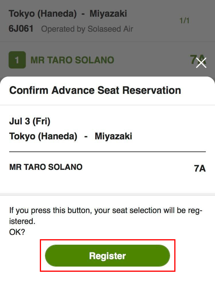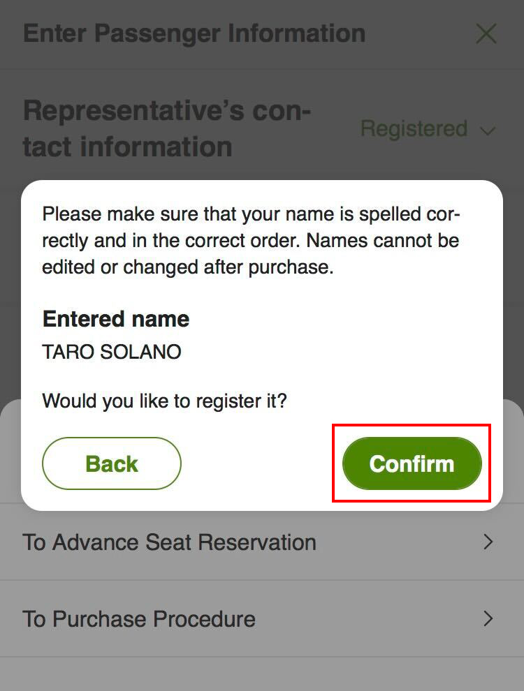 When the passenger name field is green, click the "Confirm" button to complete your seat reservation.