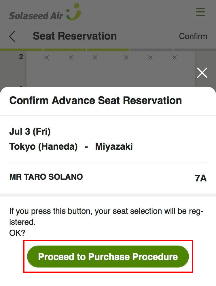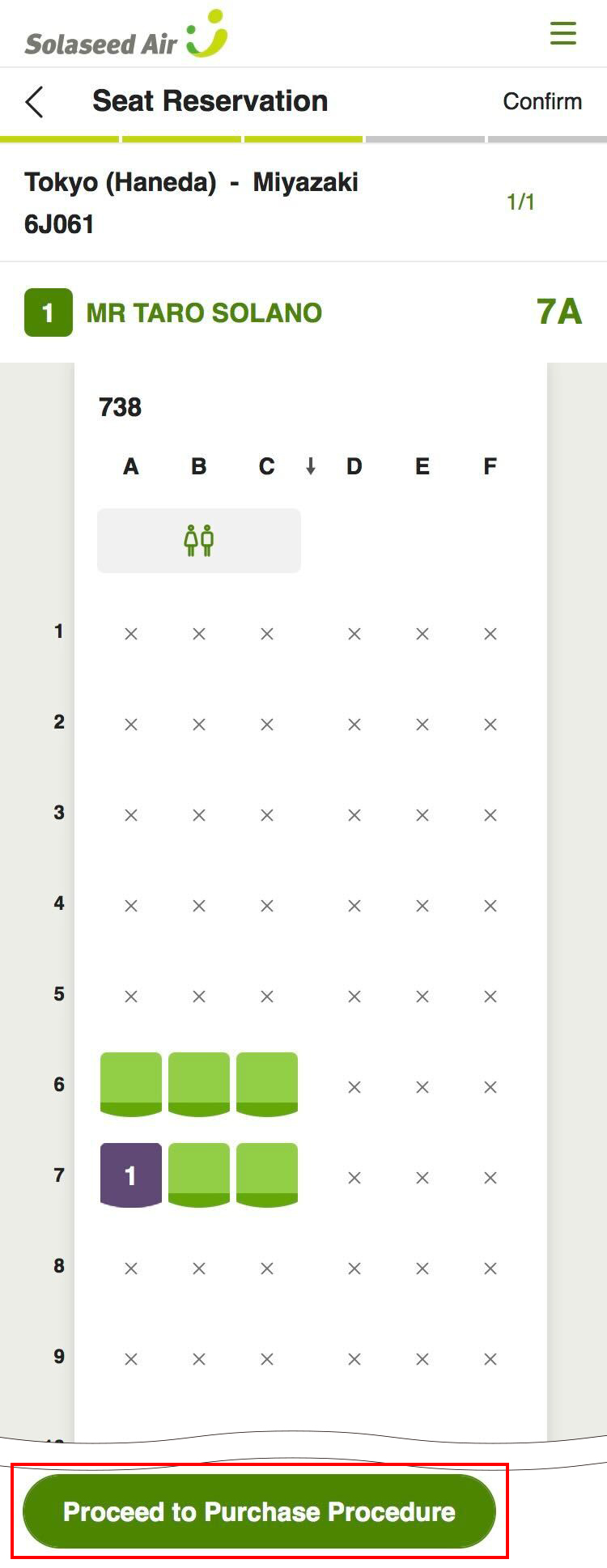 Seats displayed in green on the seat map are available for advance selection. Please select a seat for each passenger and click the "Proceed to Purchase Procedure" button at the bottom of the page.