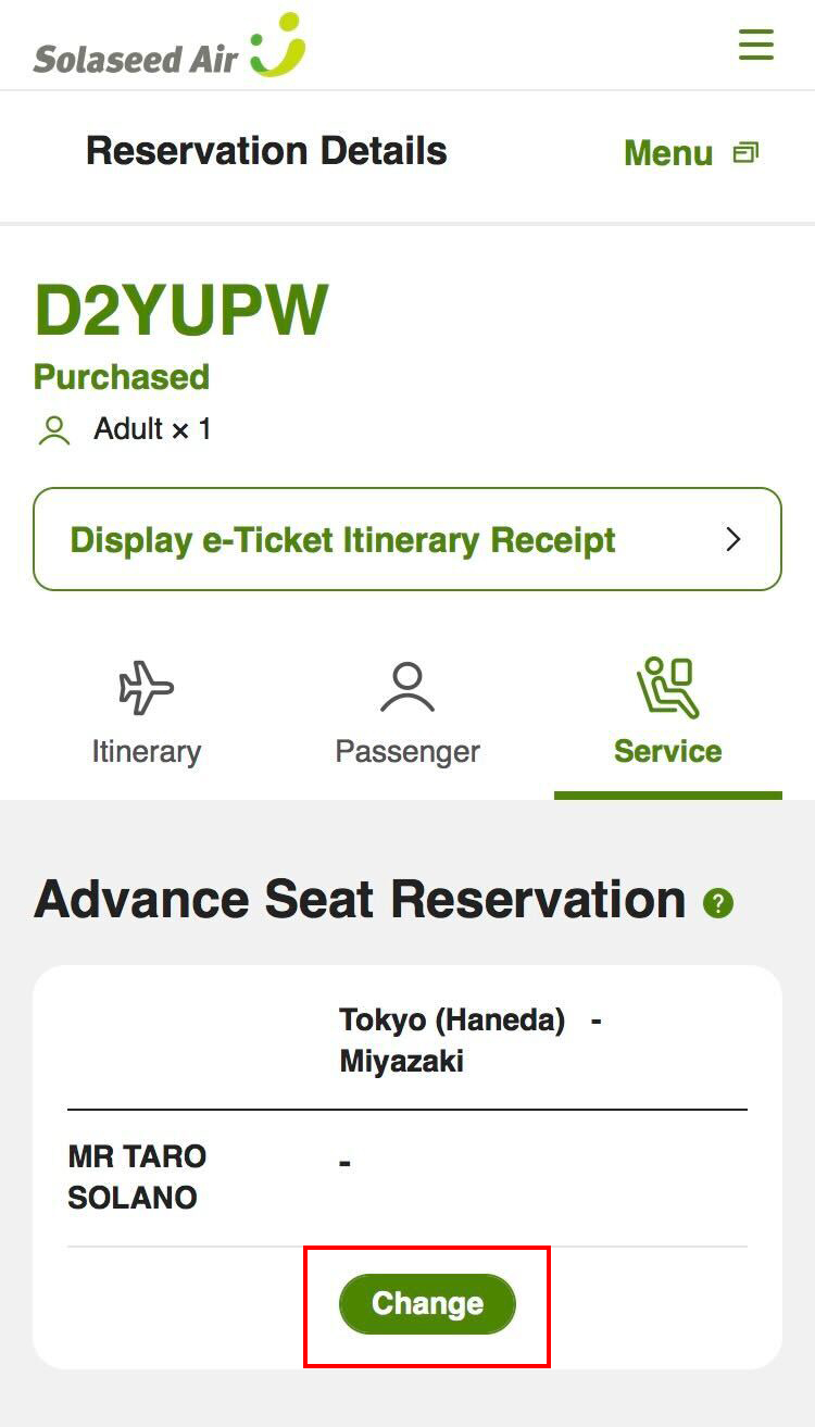 Search for your reservation from the top page. From the "Service" tab on the "Reservation Details" screen, click the "Change" button.
