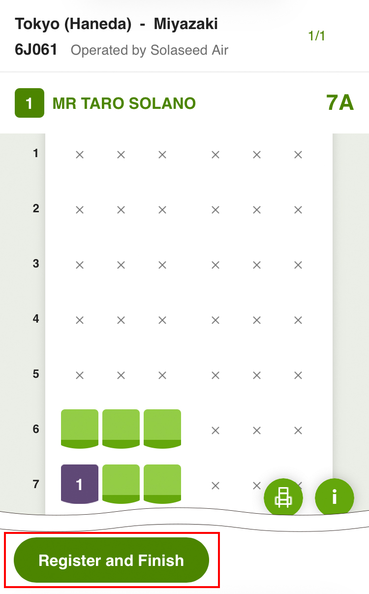 Please select a seat for each passenger and click the "Register and Finish" button at the bottom of the page.