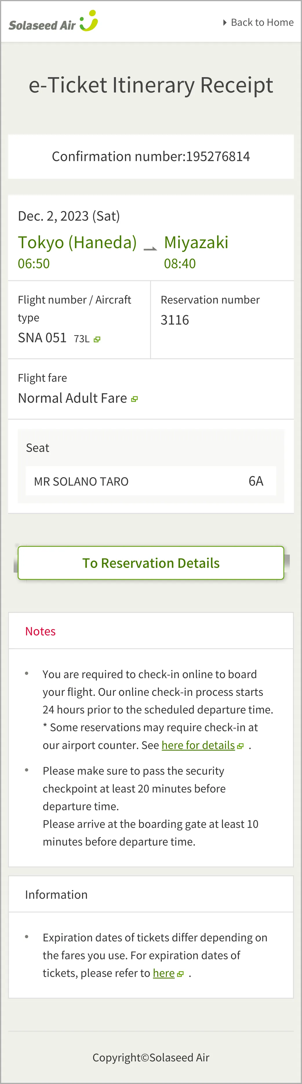 If you made a reservation on the Solaseed Air website or through Reservation and Information Center, e-Ticket Itinerary Receipt can be obtained on the Solaseed Air website.