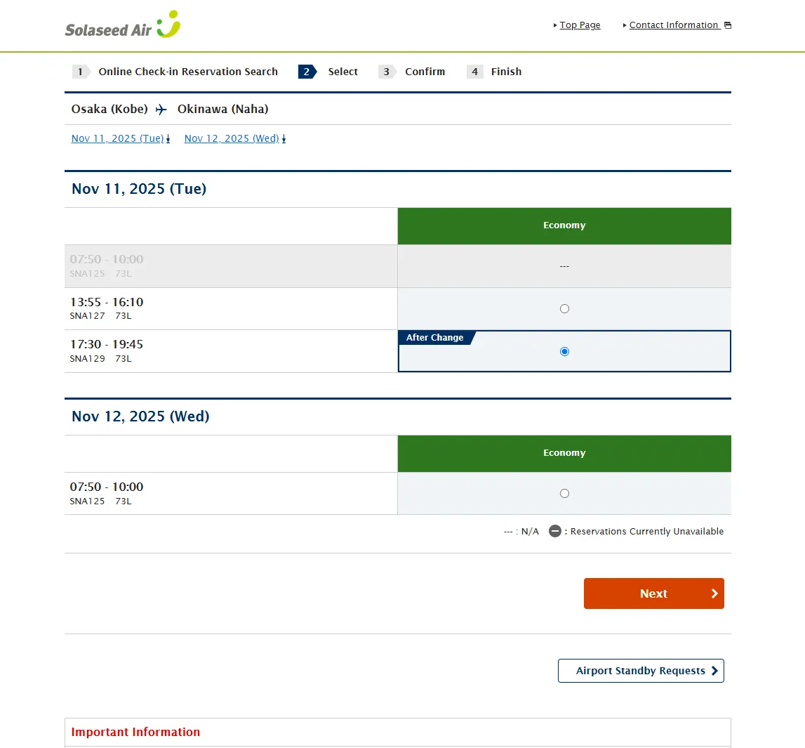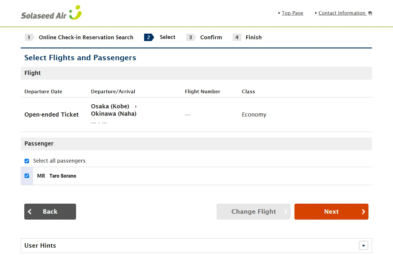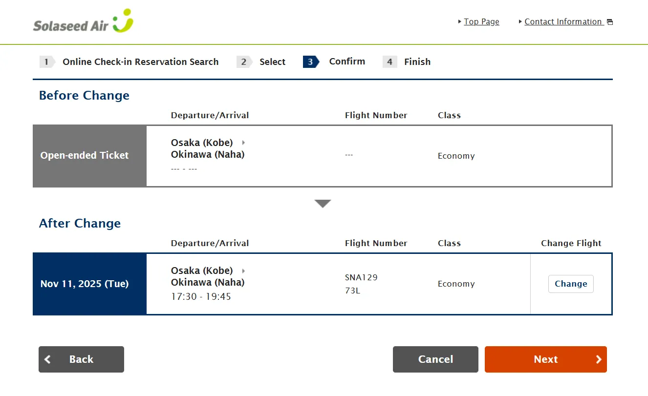 - If there is no seat available for selection, please contact the Solaseed Air Reservation and Information Center.