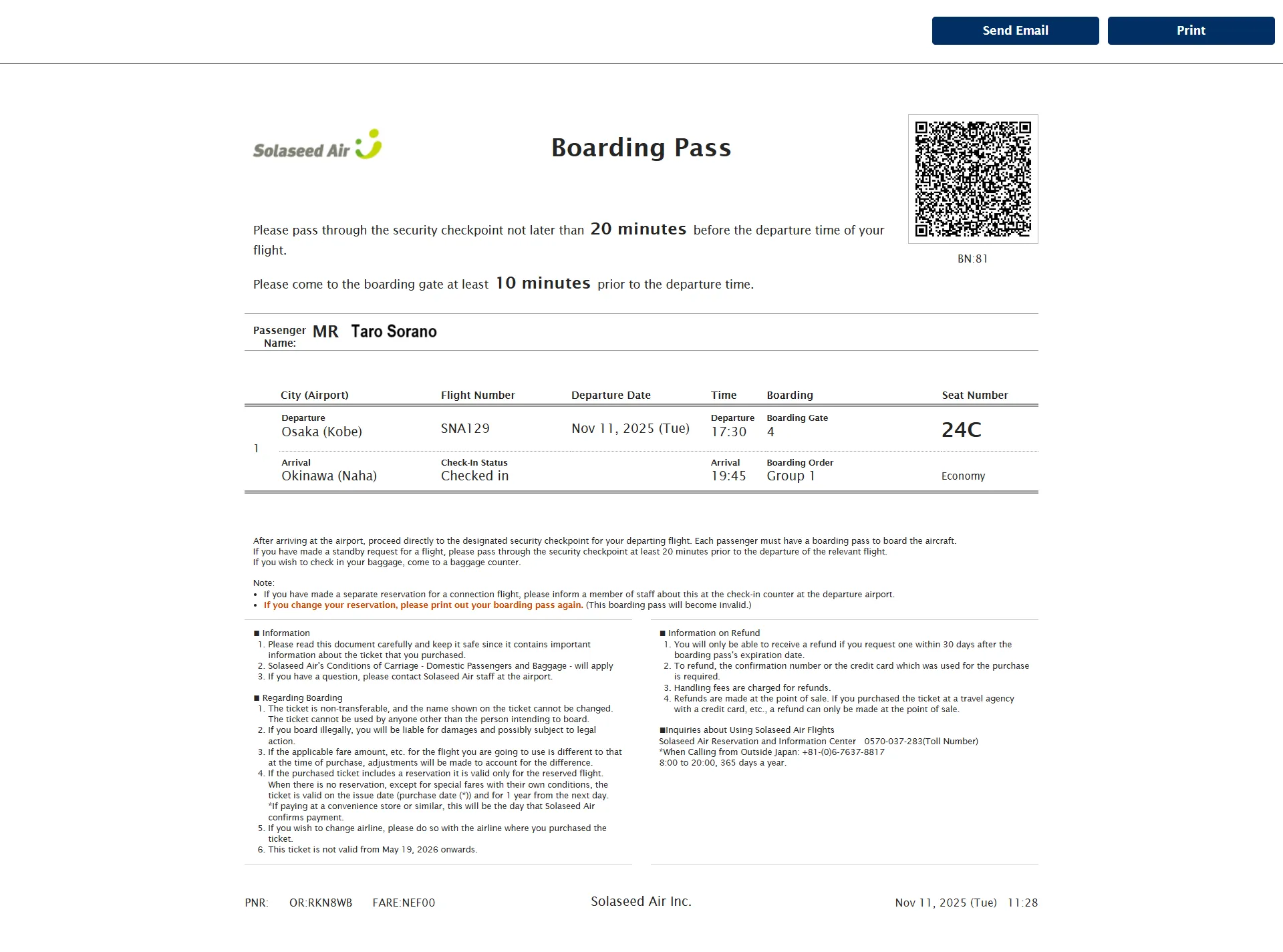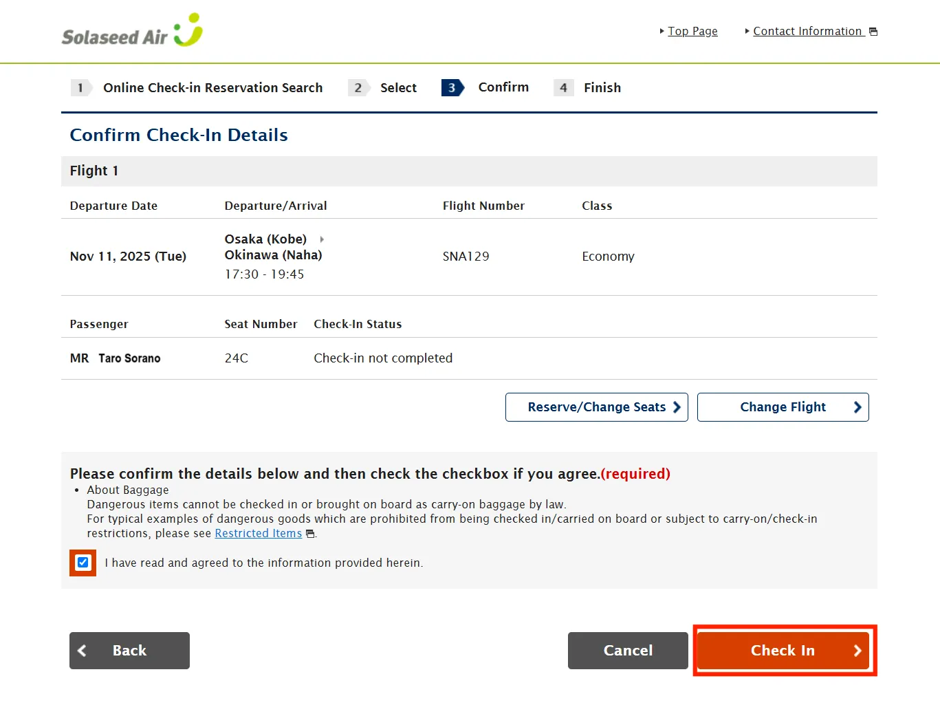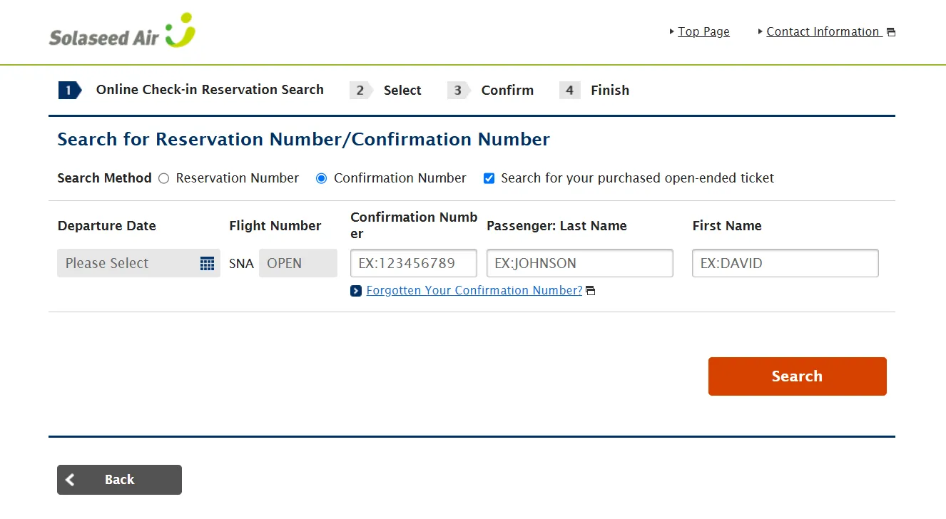 - If there is no seat available for selection, please contact the Solaseed Air Reservation and Information Center.