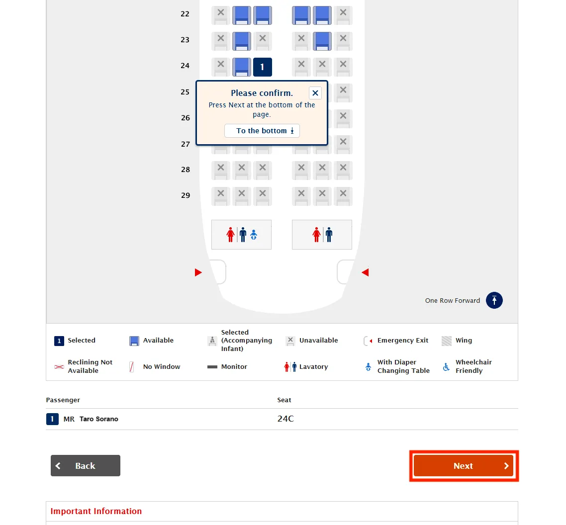 Select the seat you would like to reserve among the seats displayed in blue, and click (tap) "Next".