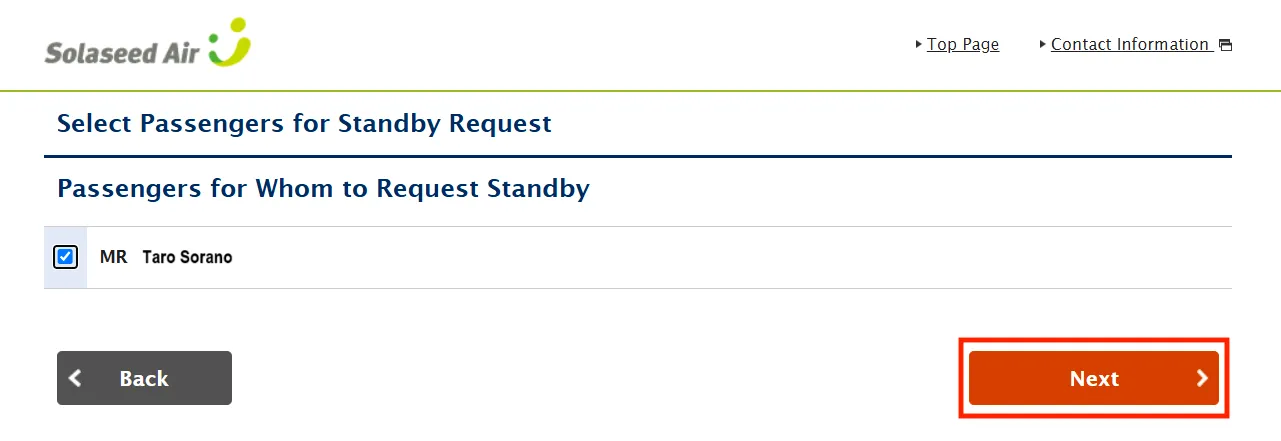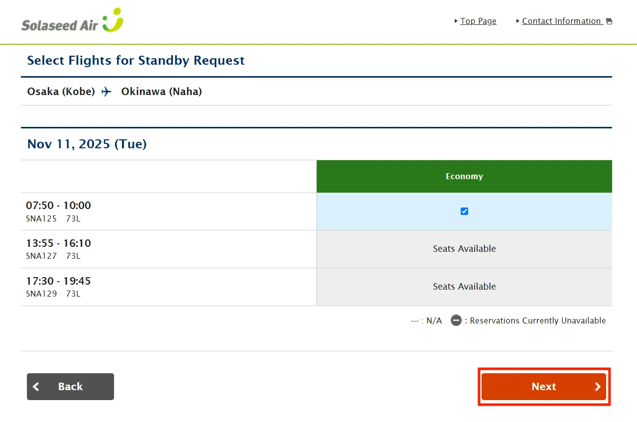 Select the flight for standby and click (tap) "Next". Check box(es) will be displayed for the flight available for application for the standby list.