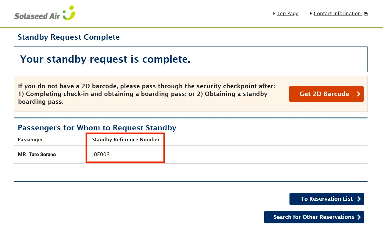 Procedures for application for the standby list are completed when the airport standby number is issued.