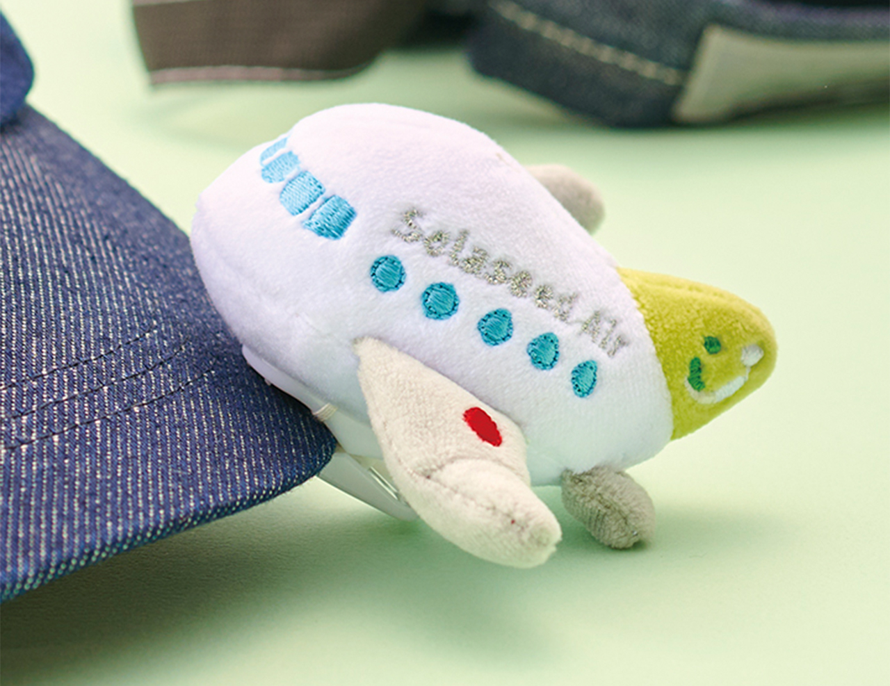 ソラシドエアオリジナルの飛行機型ぬいぐるみ。飛行機のお腹部分についているクリップを使って、お子さまの肩に乗せたり、バッグのふちに挟んで目印にしたりと、使い方は自由自在。このかわいい飛行機と一緒に旅先で記念撮影をすれば、旅のワクワク感が高まること間違いなしです。