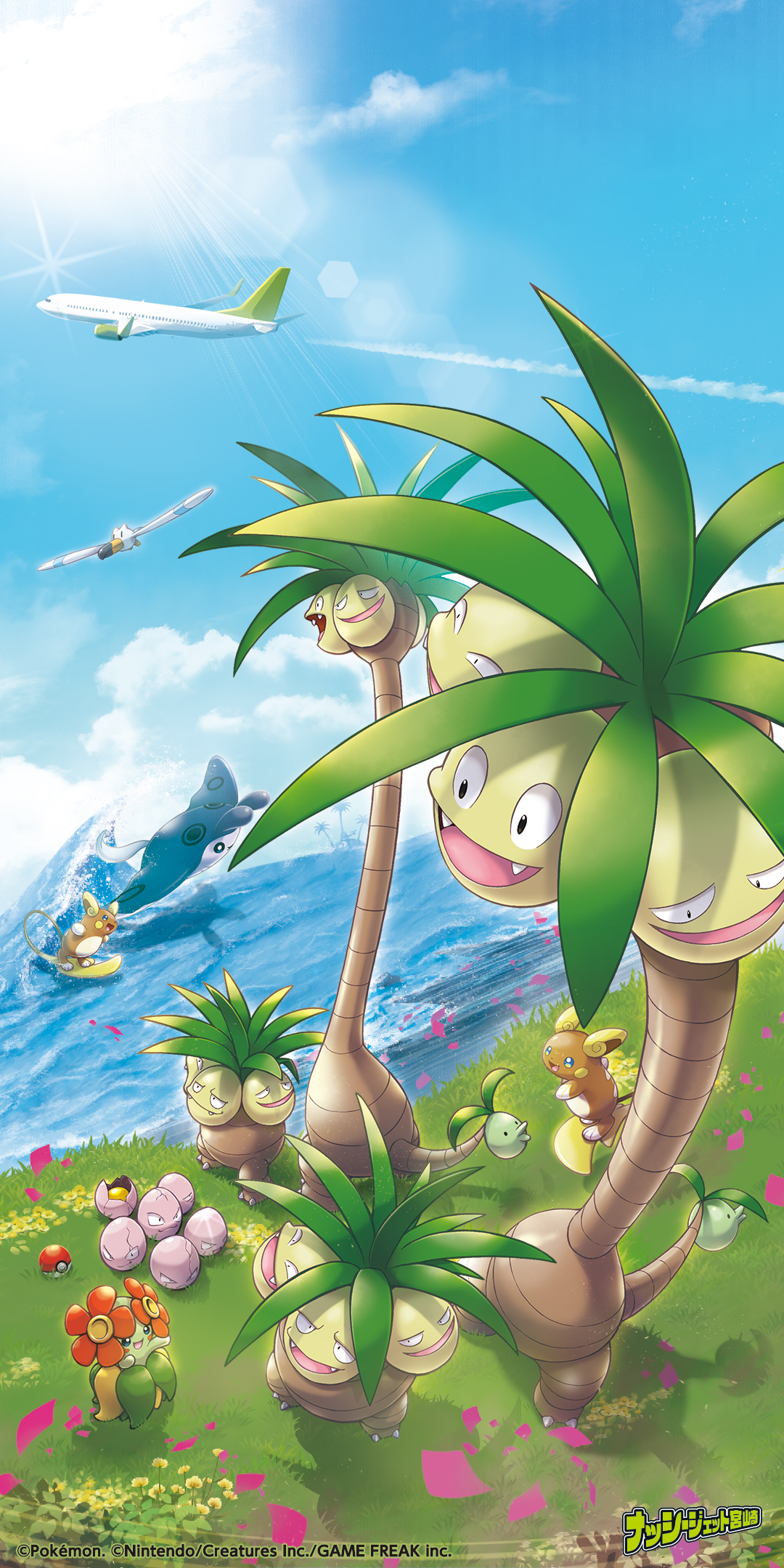 「日本のひなた」とも呼ばれ、温暖な気候で一年中温かい宮崎県は、ヤシ科の「フェニックス」を県の木として制定しています。そしてヤシの木のような見た目で「歩く熱帯雨林」と呼ばれるナッシーは、宮崎県のイメージにピッタリということで、アローラナッシーと共に「宮崎だいすきポケモン」に任命されました。 そしてこの度、ソラシドエアの機体デザインとして、ナッシーとアローラナッシーが大きく描かれた南国の雰囲気たっぷりの「ナッシージェット宮崎」が誕生します。