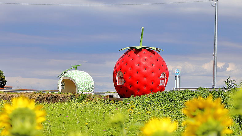 イチゴやメロン、ミカンなど 全5種類16基のフルーツを模したバス停が国道沿いを中心に設置されており、フルーツバス停がある道路は「ときめきフルーツバス停通り」の愛称で親しまれています。