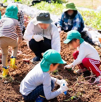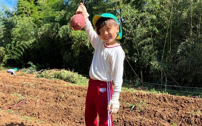 5月に植え付けしたさつまいもは順調に育ち、待ちに待った収穫日を迎えました。大きく実った無農薬の「紅はるか」を見て、一緒に収穫する地元の保育園の子どもたちは大喜び♪とれたての大きなさつまいもと一緒に「ハイ、チーズ」。