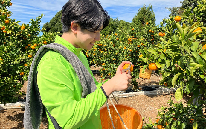 さつまいもを収穫した後は、株式会社イノPの社員の方の果樹園でみかんの収穫体験も行いました!オレンジ色に色づき実ったたくさんのみかんを農家の方、子どもたち、ソラシドエアの社員で収穫し、美味くいただきました🍊