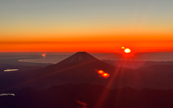 羽田空港を離陸後、午前6時20分頃に南アルプス南部の上空に到着し、高度約5,180メートルから富士山と初日の出を鑑賞していただきました。