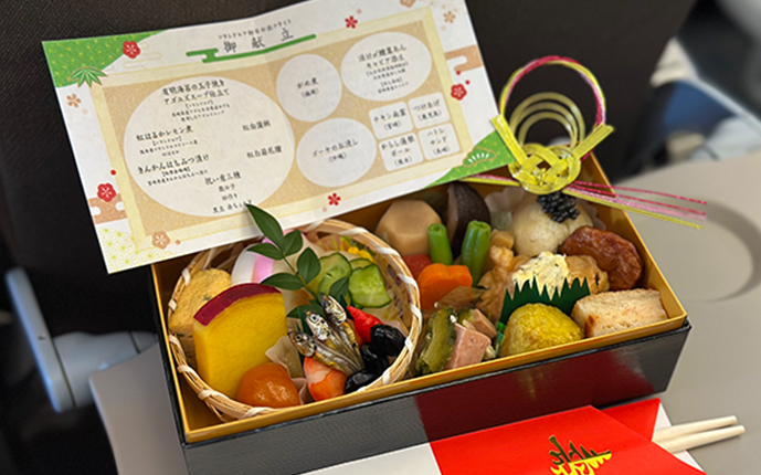初日の出を鑑賞していただいた後、宮崎空港に向かう機内では、弊社が熊本県宇土半島で運営する「ソラシドエコファーム」で収穫したさつまいも「紅はるか」をはじめとする、九州・沖縄の食材にこだわったおせちや、ソムリエ資格を持つ客室乗務員が厳選した宮崎県産のワインをご提供。