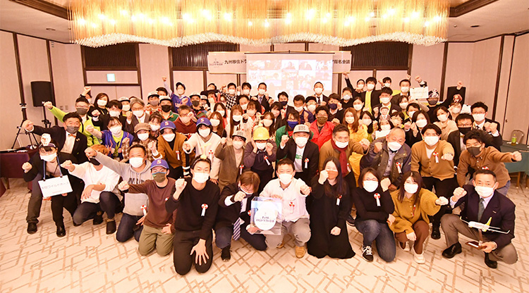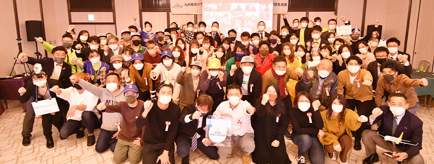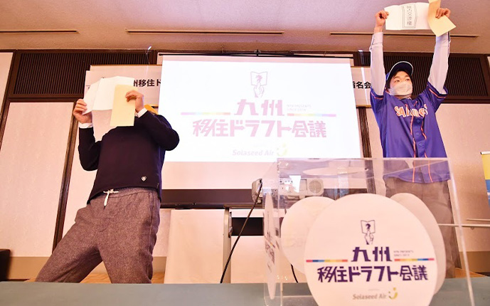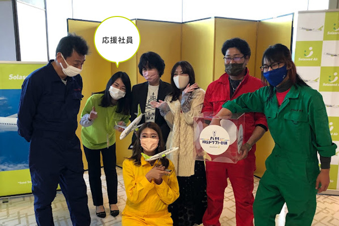 「九州移住ドラフト会議2022」はソラシドエアがメインスポンサーを務めました。指名会議は、2020年7⽉の豪⾬で⼤規模な浸⽔被害を受けた球磨川くだりの発船場に、人吉の復興のランドマークとして建てられた「HASSENBA HITOYOSHI KUMAGAWA」近くで開催されました。微⼒ながら復興を応援したいという想いを込めて、応援社員も一緒に参加しました。