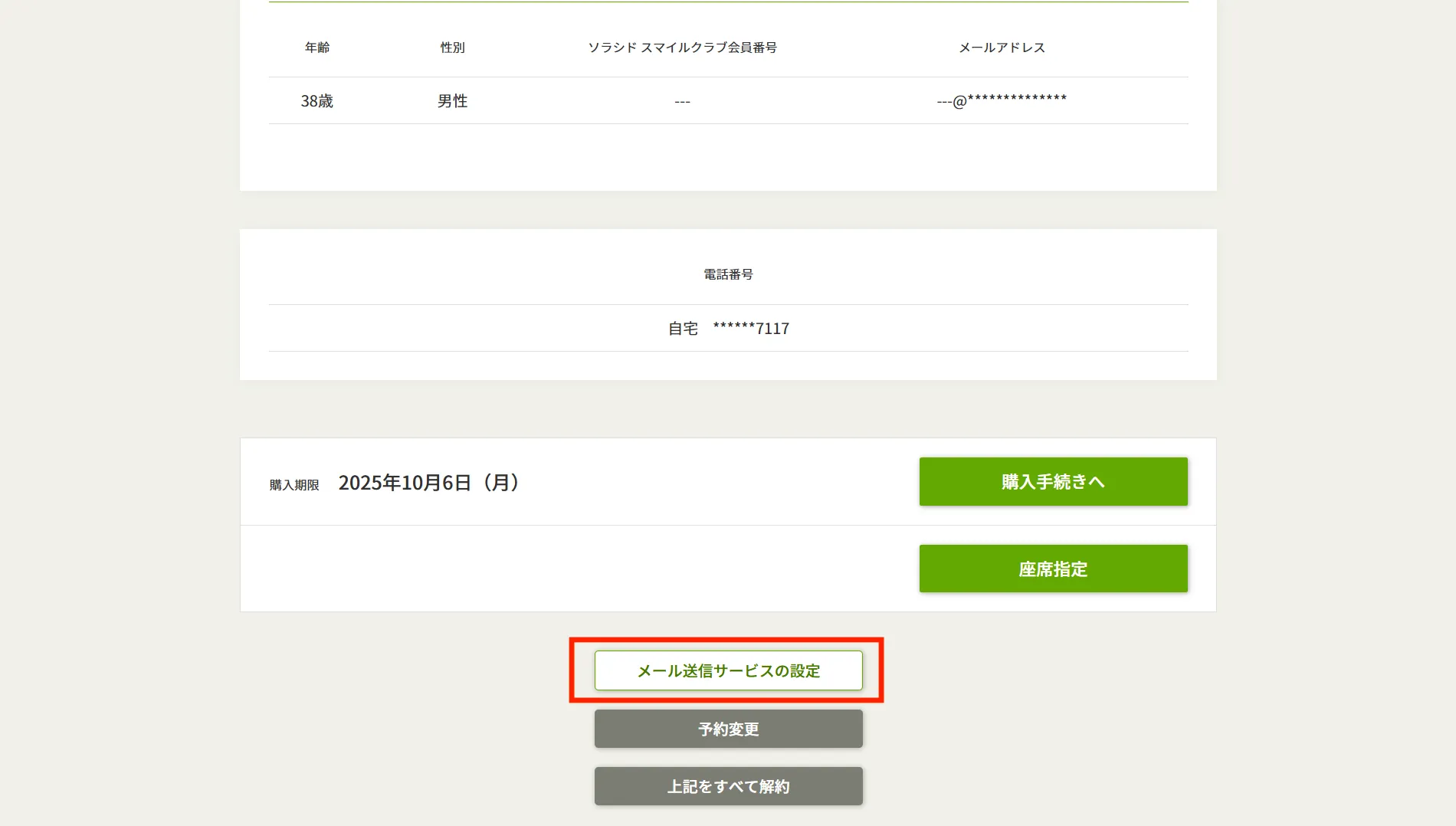 予約完了時/予約確認時に表示される「予約詳細」画面より「メール送信サービスの設定」を選択してください。