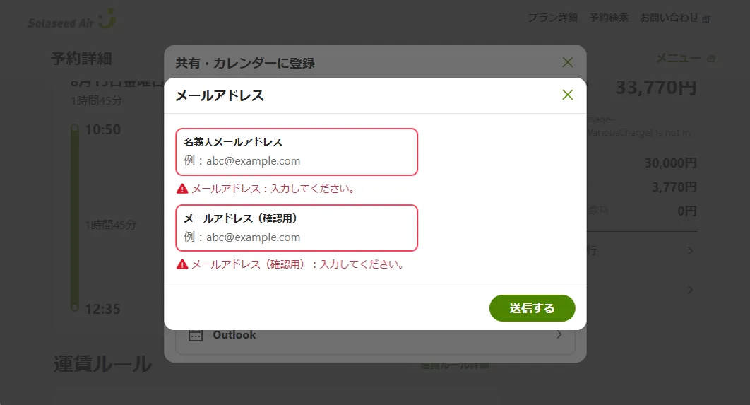 - ソラシドエア ホームページ以外(ソラシドエア予約・案内センター、指定旅行会社など)で予約変更や解約などをされた場合は、メールは送信されません。