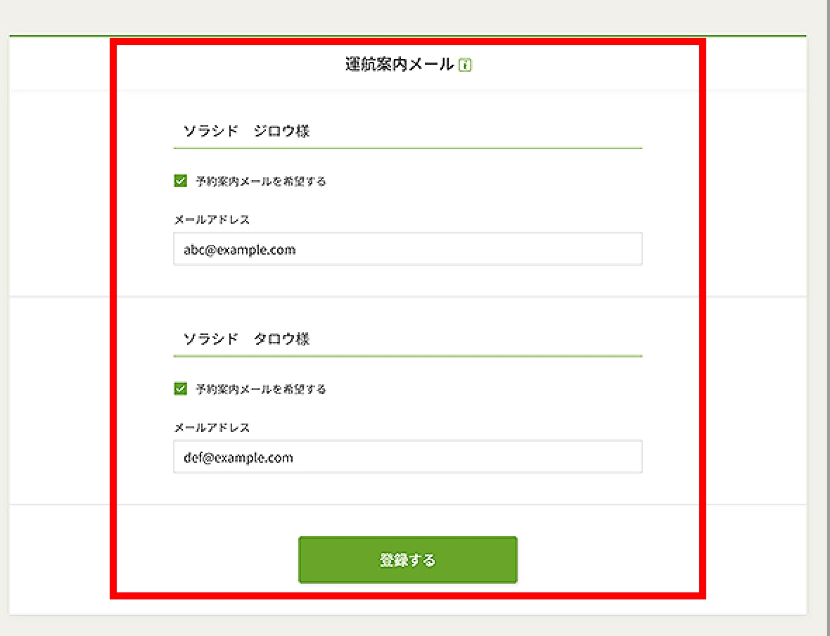 複数名で予約されている場合、運航案内メールをご希望の方は各搭乗者名の枠内にある「メールアドレス」をご入力ください。予約案内メールをご希望の場合は、「予約案内メールを希望する」にチェックを入れ、最後に「登録する」ボタンを押してください。