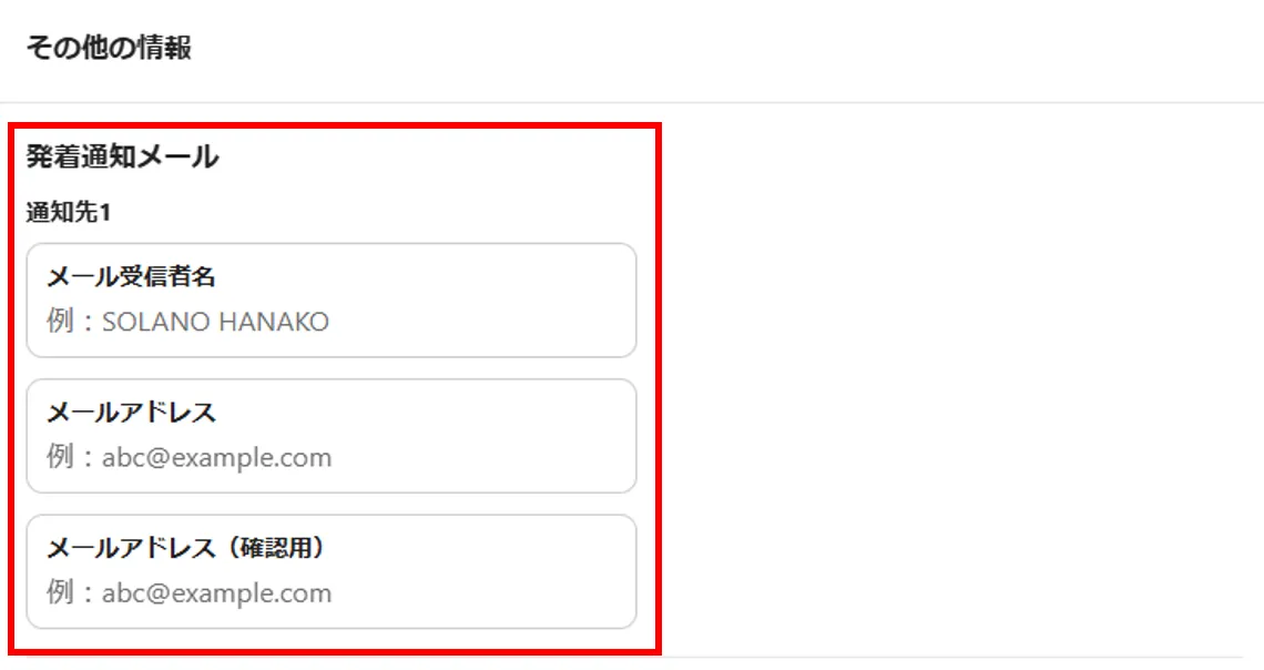 予約時に表示される「搭乗者情報の入力」画面下部の「その他の情報」の「発着通知メール」のタブにて、搭乗者ごとに通知先のメール受信者名とメールアドレスを入力ください。