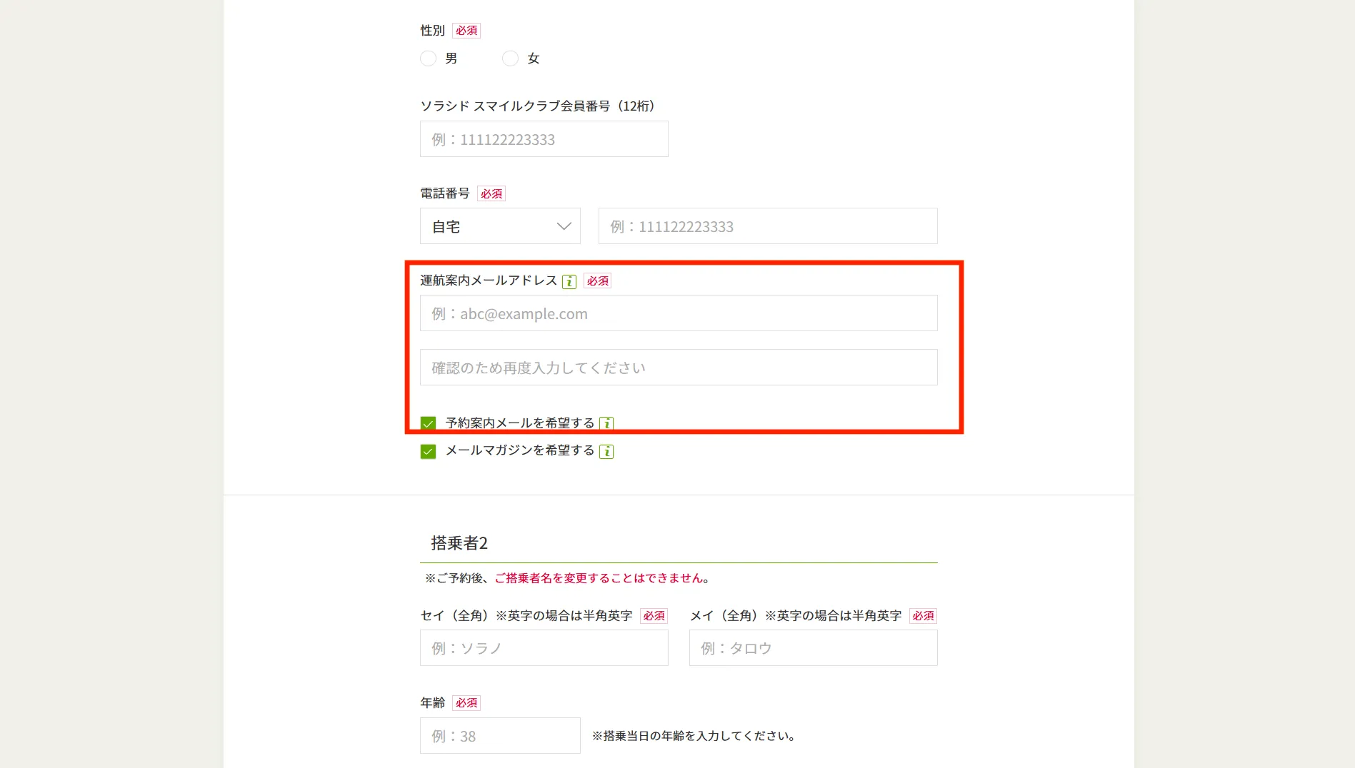 複数名で予約されている場合、運航案内メールをご希望の方は「搭乗者2」以降の入力項目「メール送信サービス」の部分に「メールアドレス」をご入力ください。