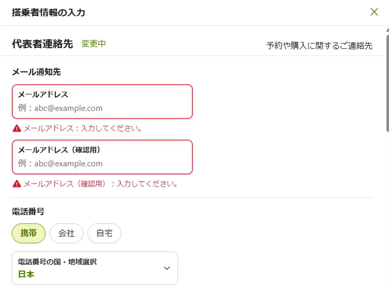予約時に表示される「搭乗者情報の入力」画面にて、「代表者連絡先」の「メール通知先」を入力ください。