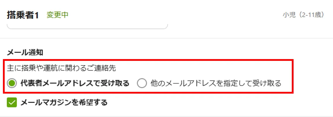 搭乗者ごとに、「メール通知」にて、搭乗や運航に関わるメールアドレスを代表者メールアドレスで受け取るか、他のメールアドレスを指定して受け取るかを選択できます。ご希望の連絡先を選択ください。