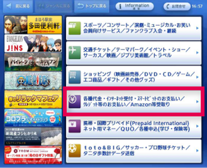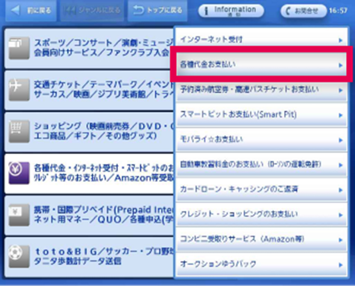 メニュー画面中段の[各種代金・インターネット受付・スマートピット(Smart Pit)/クレジット等のお支払い/Amazon等受取り]を選択してください。
