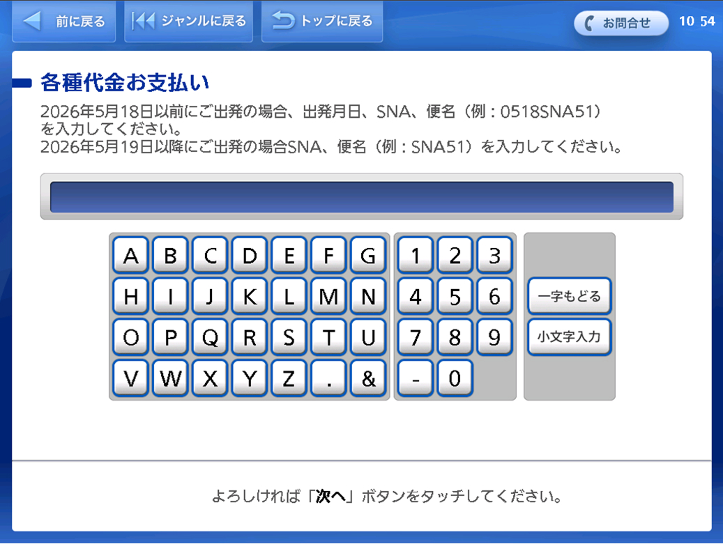 - 2026年5月18日以前にご出発の場合、出発月日、SNA、便名(例:0518SNA51)を入力してください。
