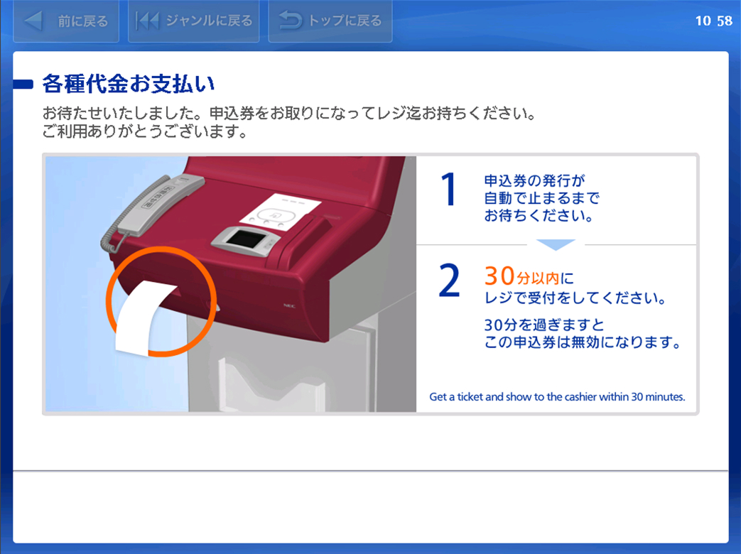 プリントアウトされた「申込券」を30分以内にレジにお持ちいただき、現金でお支払いください。お支払い後、「取扱明細兼受領書」をお受け取りください。