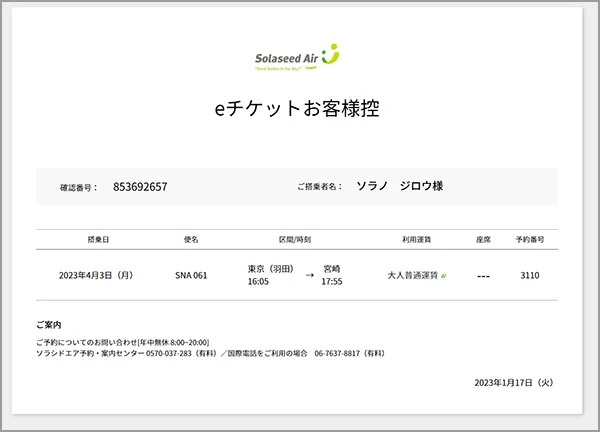 ソラシドエア ホームページもしくは予約・案内センターでご予約の場合には、ソラシドエア ホームページで、eチケットお客様控の取得が可能です。