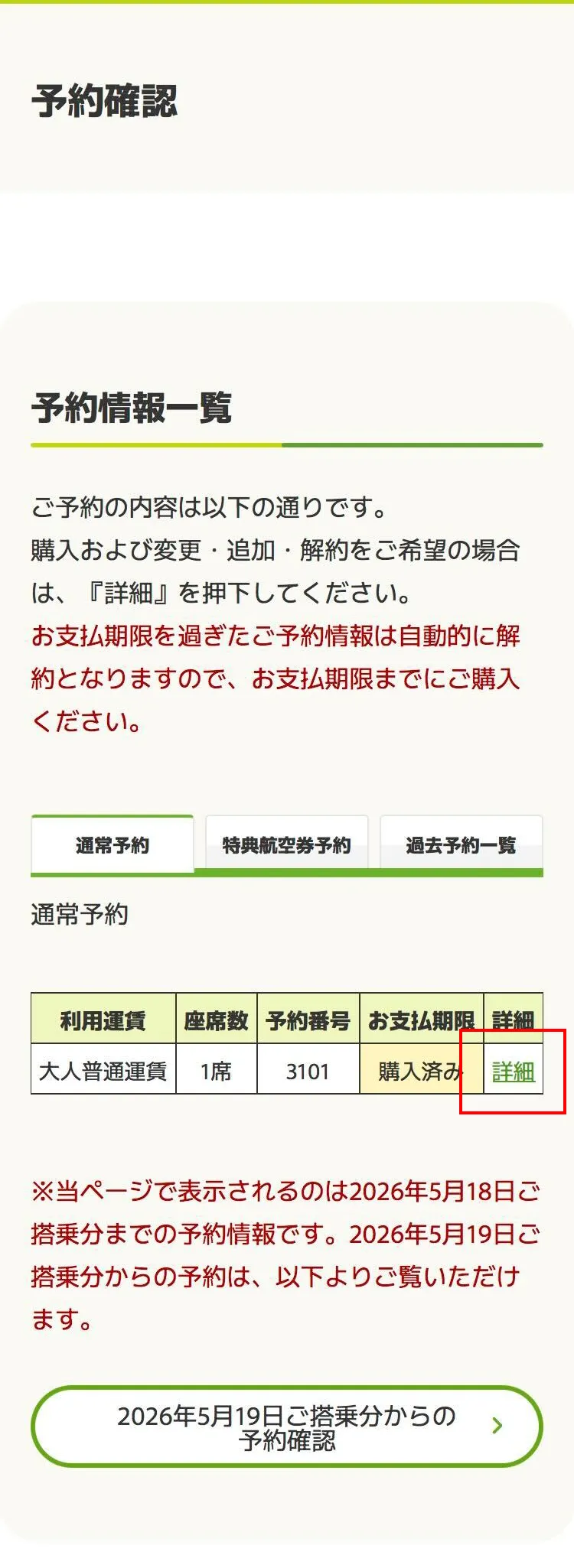 ソラシド スマイルクラブ会員の方は、予約確認画面より、オンラインチェックインをおこないたい便を含む予約の「詳細」をクリック(タップ)してください。