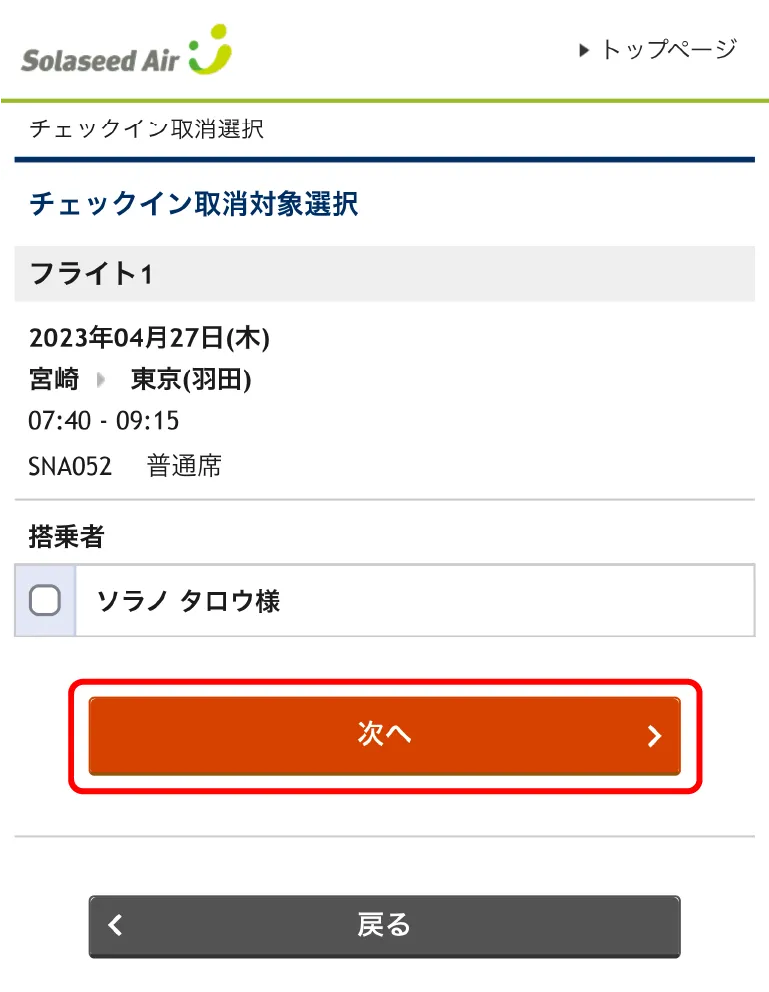 チェックイン取消をされる方を全員選択し、「次へ」をクリック(タップ)してください。