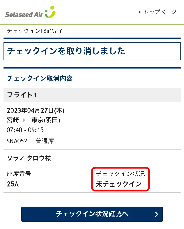 チェックインの取り消しが完了しました。
