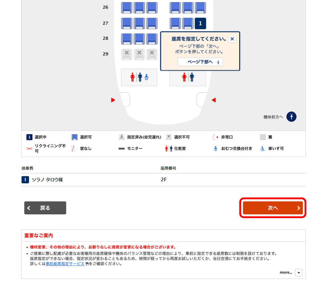 青く表示されている座席の中から、ご希望の座席を選択し、「次へ」をクリック(タップ)してください。
